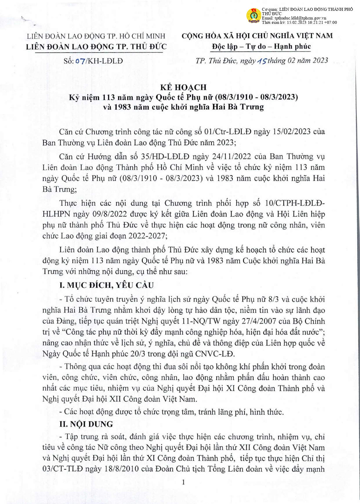 KẾ HOẠCH: Kỷ niệm 113 năm ngày quốc tế phụ nữ (08/3/1910 – 08/3/2023) và 1983...