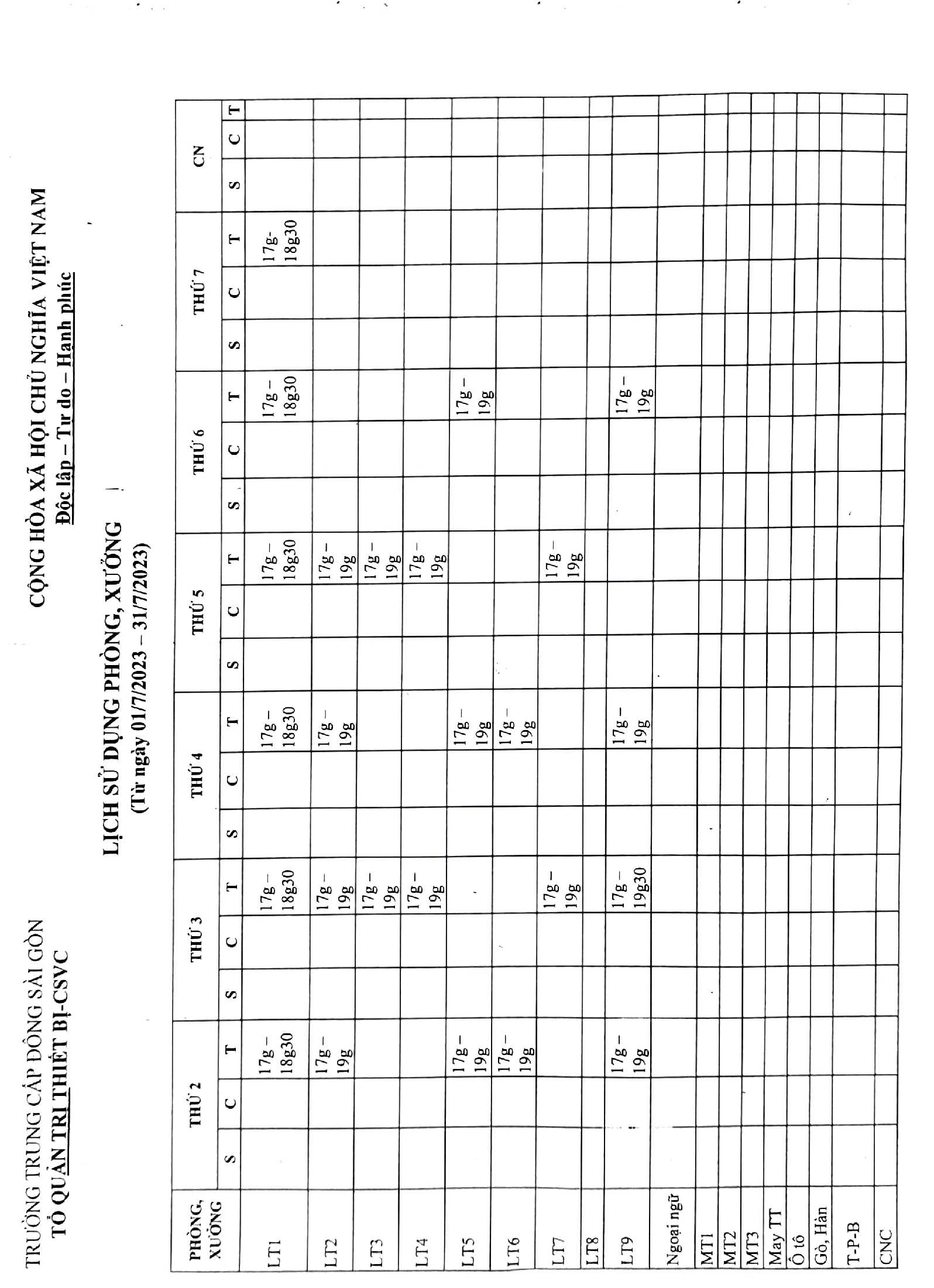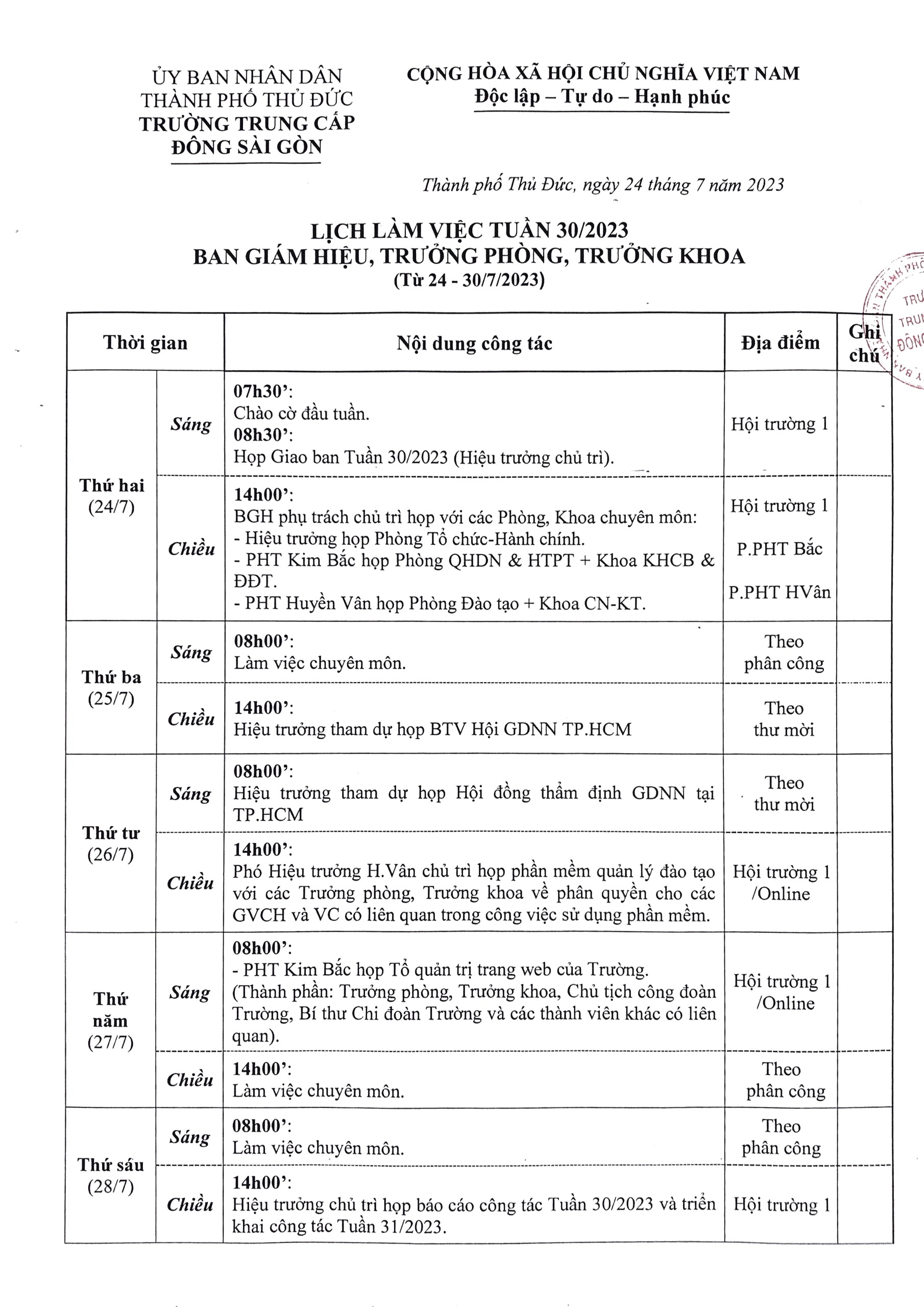 Lịch Công Tác Tuần 30/2023 Của Trường Trung Cấp Đông Sài Gòn