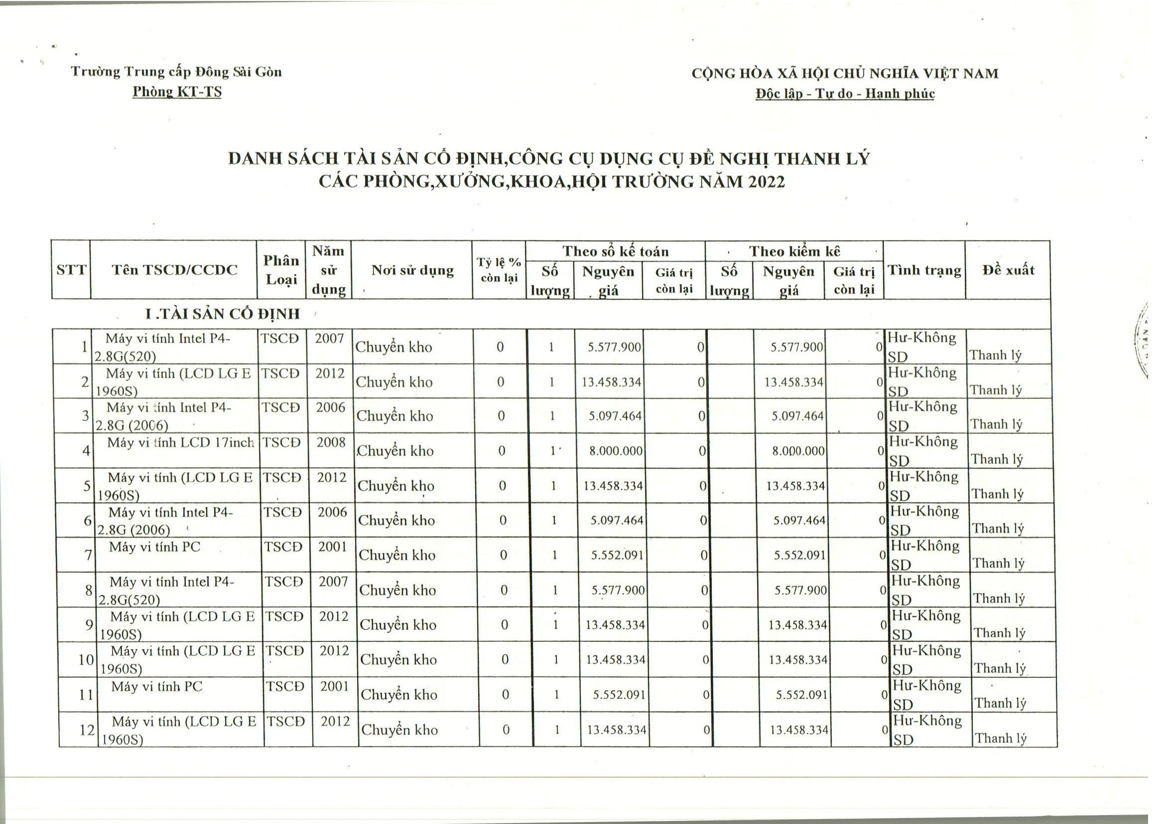 Danh sách tài sản cố định, công cụ dụng cụ đề nghị thanh lý các phòng, xưởng, khoa, hội trường năm 2022