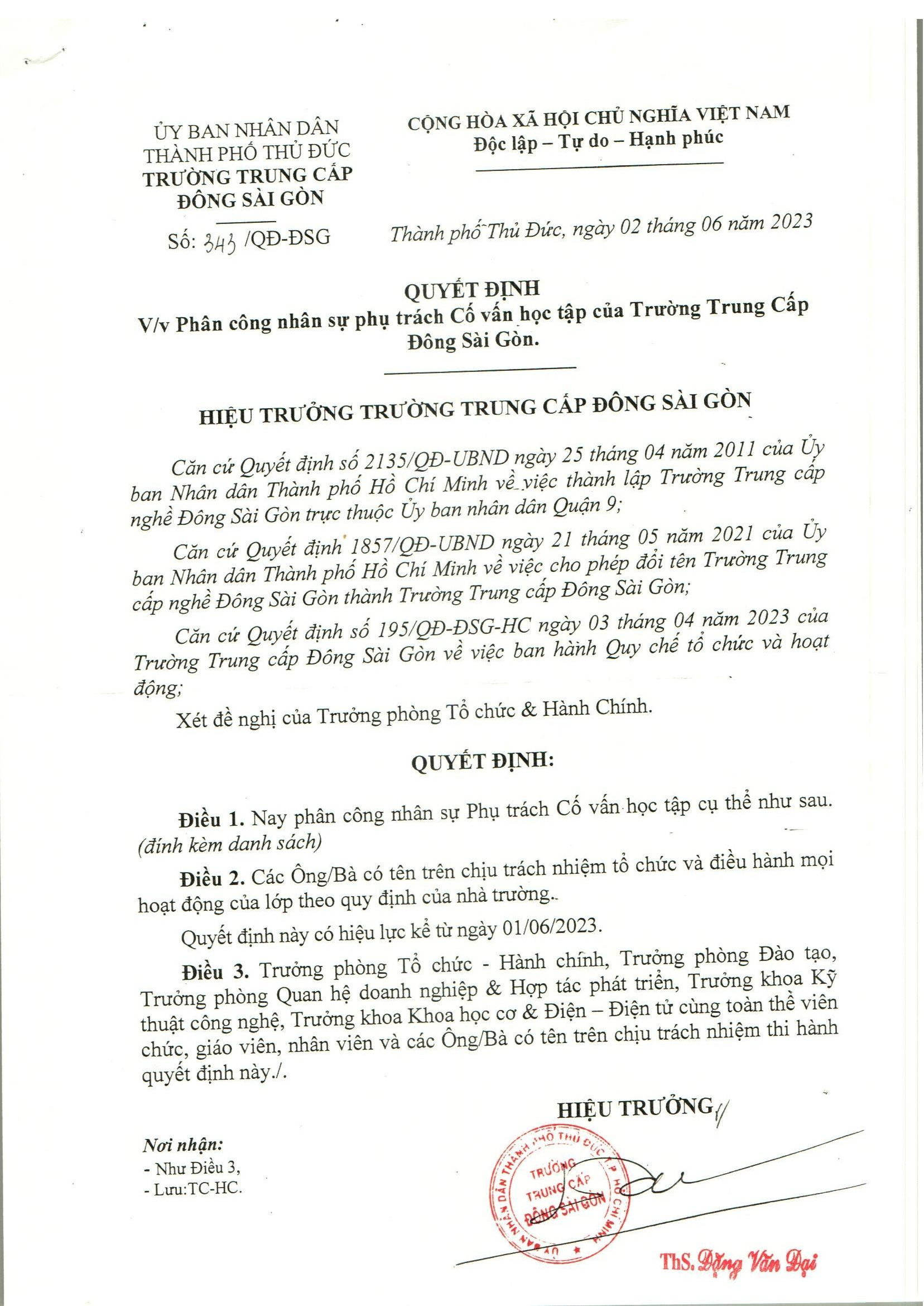 QUYẾT ĐỊNH: Phân công nhân sự phụ trách cố vấn học tập của trường TC Đông Sài Gòn
