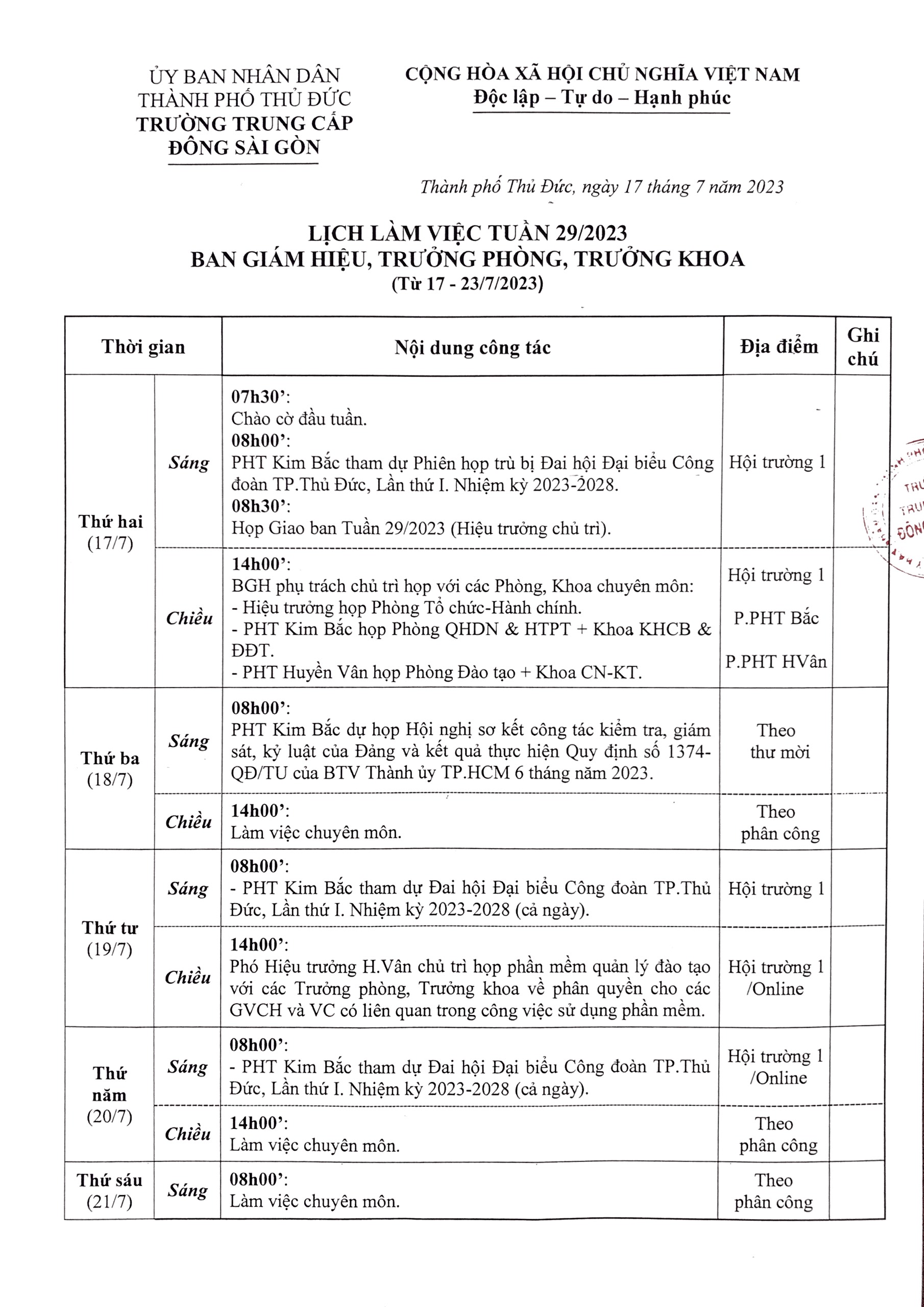 Lịch Công Tác Tuần 29/2023 Của Trường Trung Cấp Đông Sài Gòn