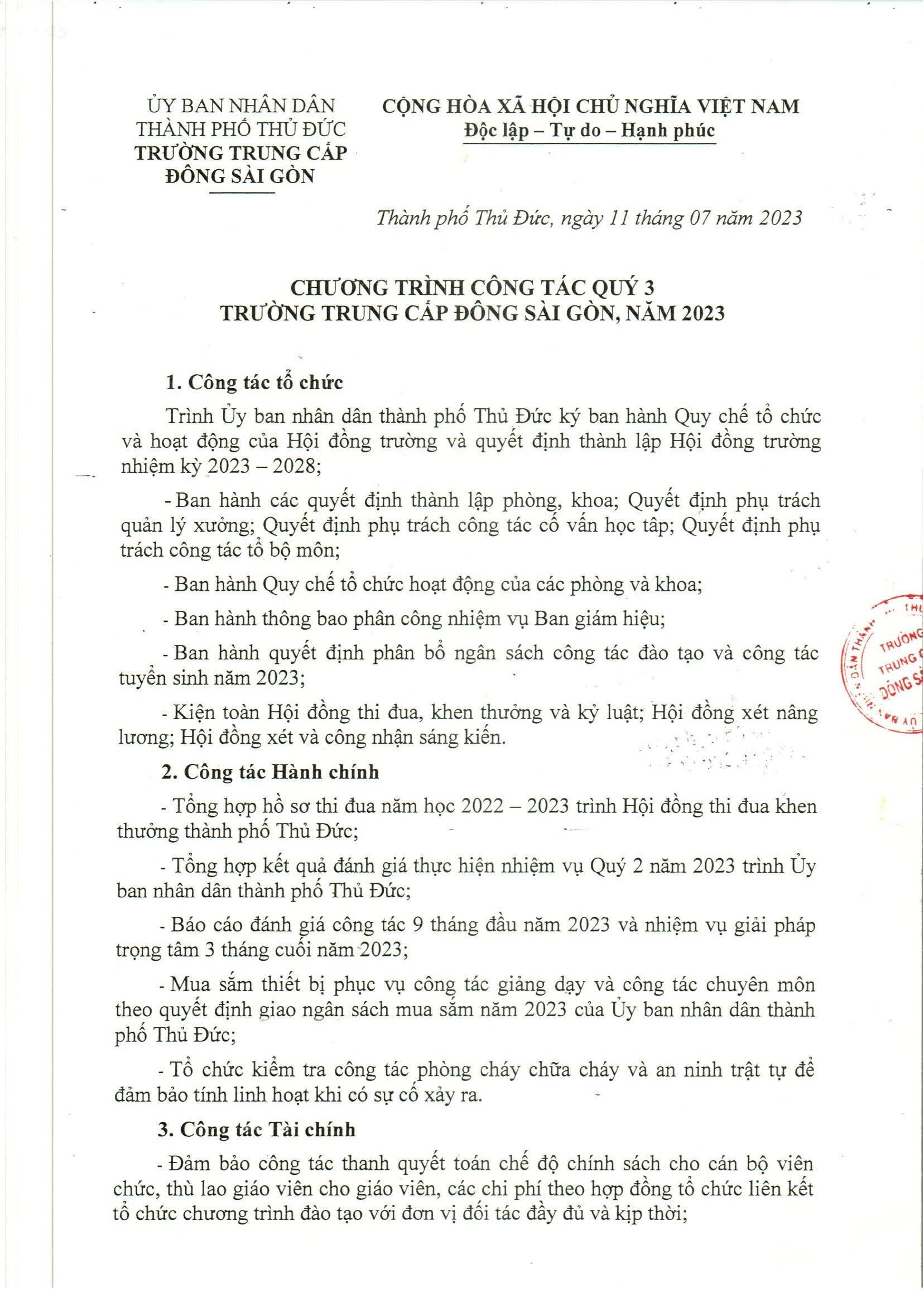Chương trình công tác quý 3 trường Trung Cấp Đông Sài Gòn, năm 2023