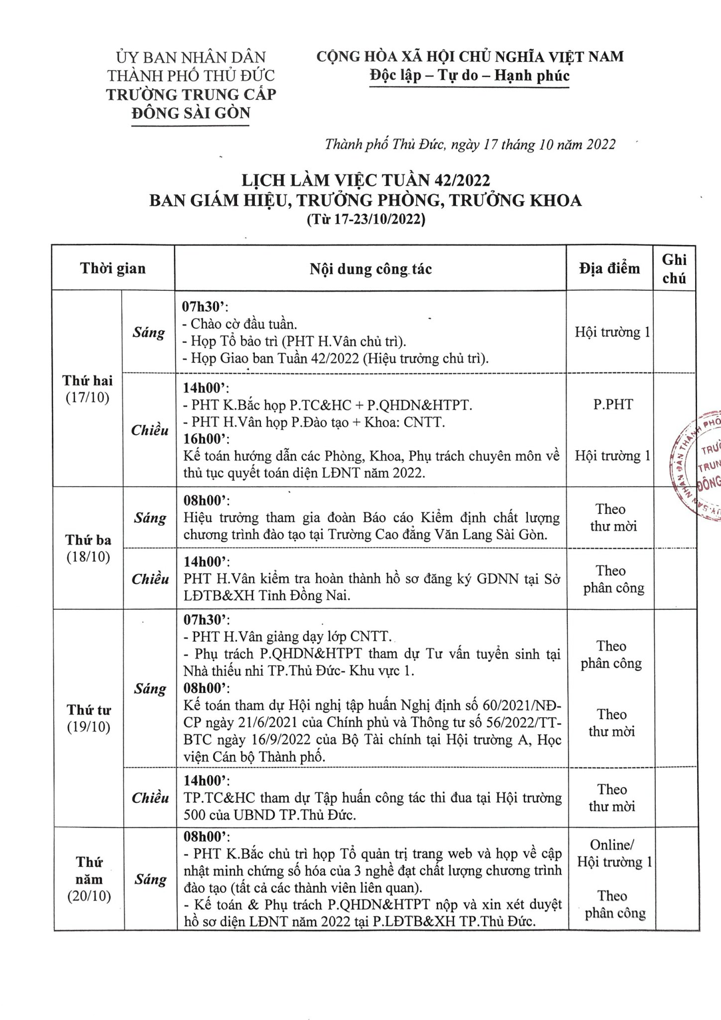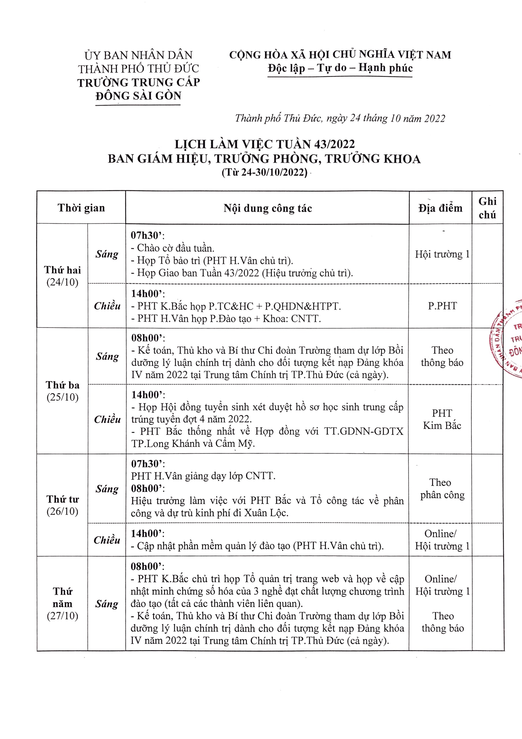 Lịch công tác Tuần 39/2022 của Trường Trung cấp Đông Sài Gòn