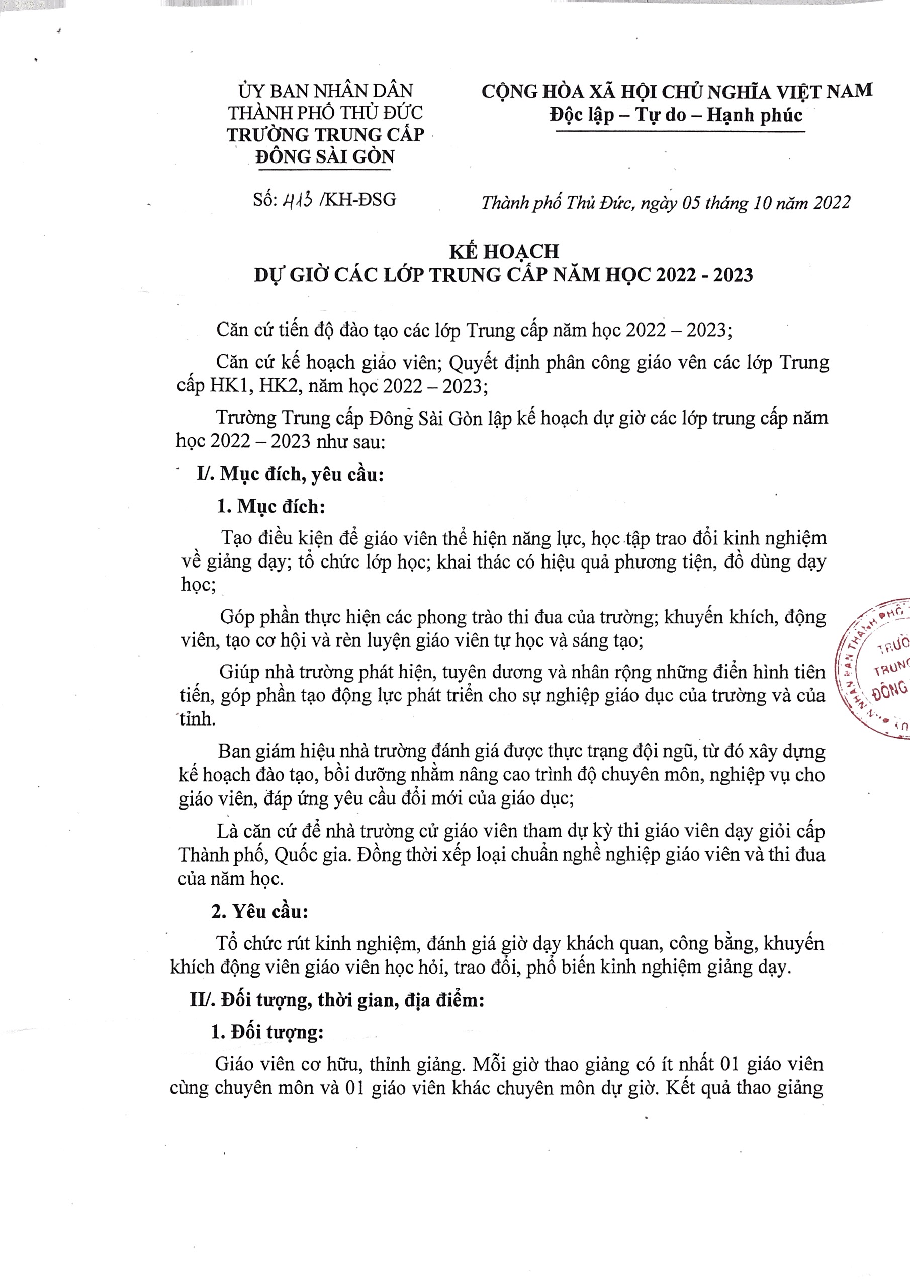 Kế hoạch dự giờ các lớp Trung cấp năm học 2022 – 2023