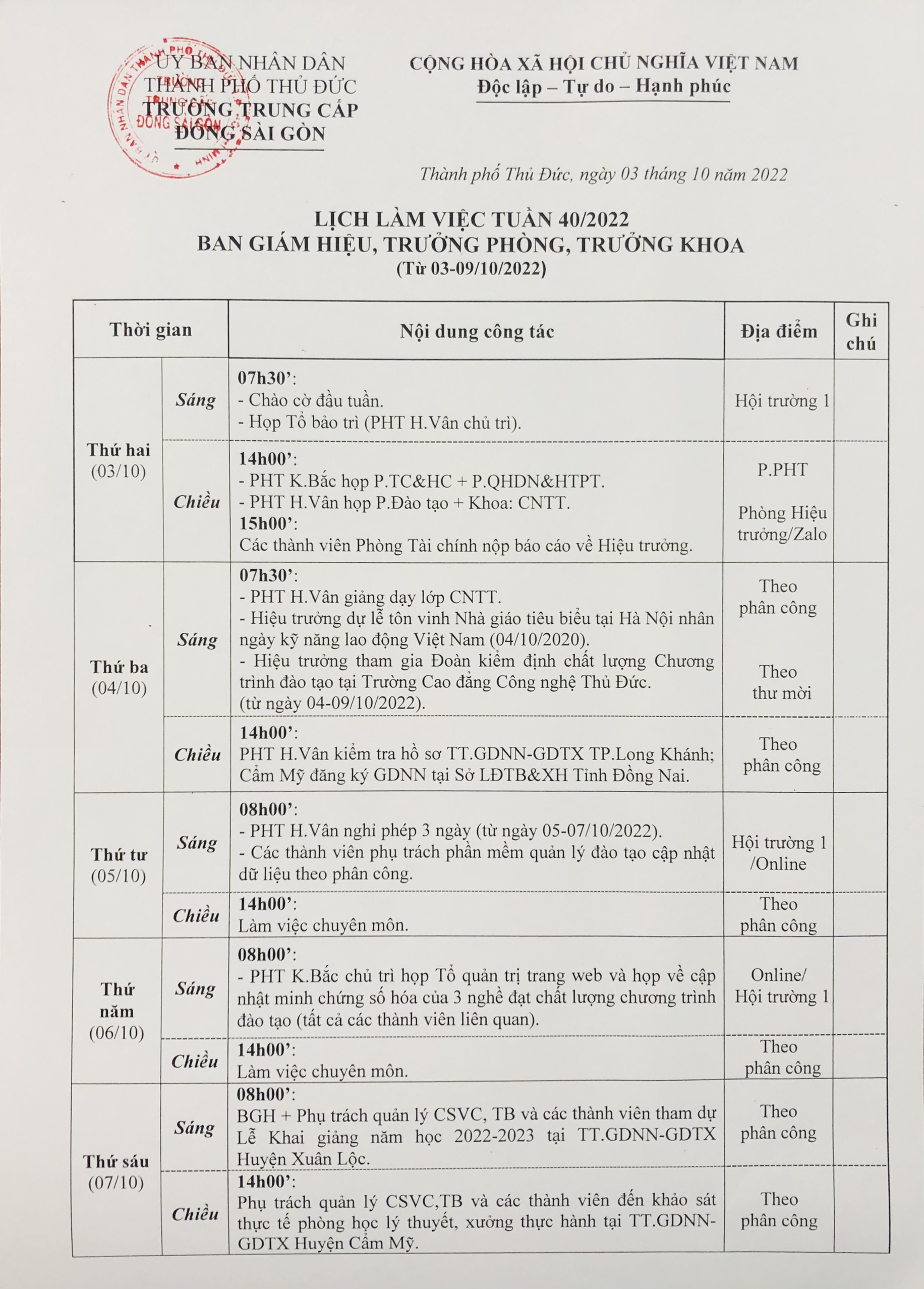 Lịch công tác Tuần 40/2022 của Trường Trung cấp Đông Sài Gòn.