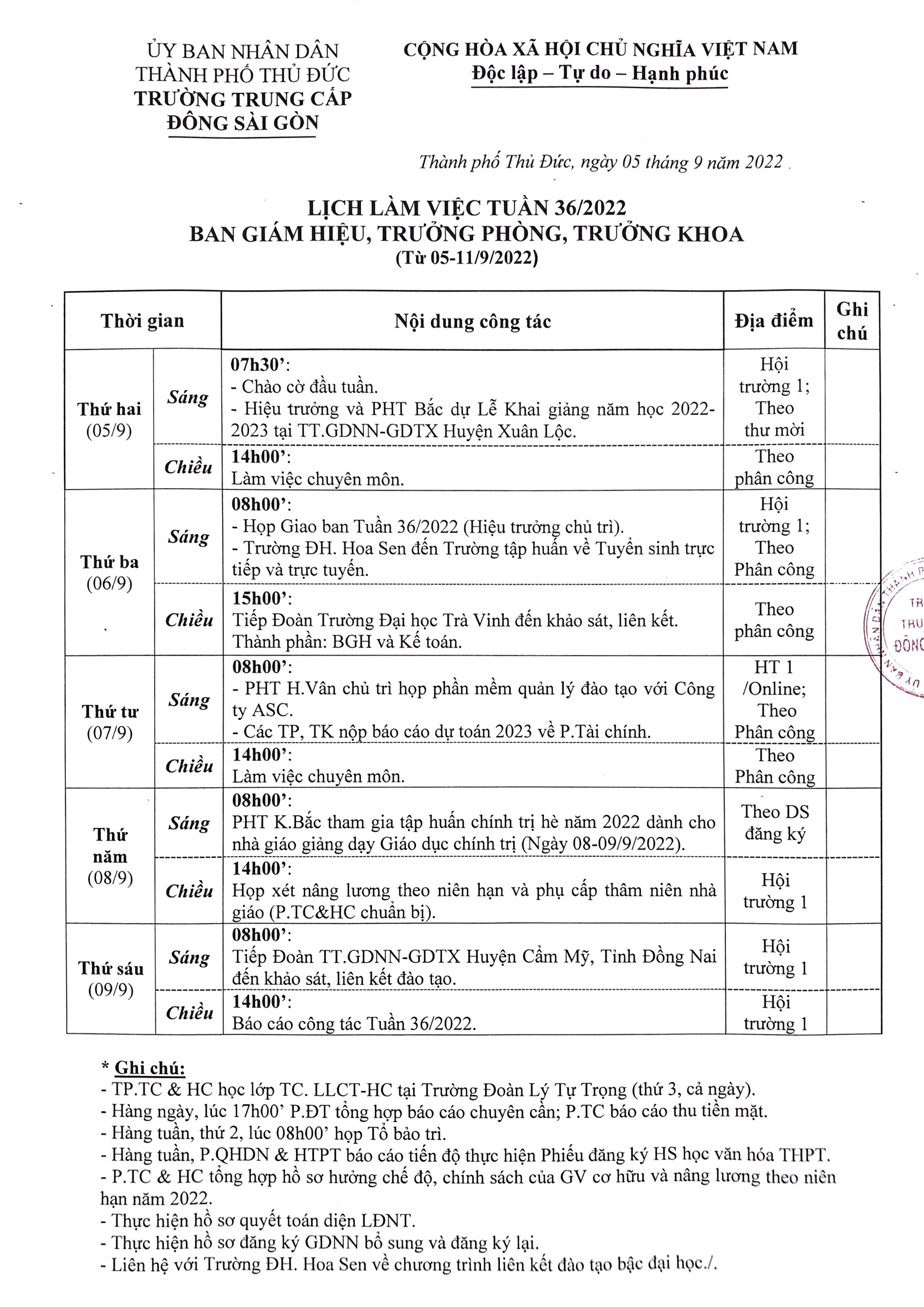 Lịch công tác Tuần 36/2022 của Trường Trung cấp Đông Sài Gòn.