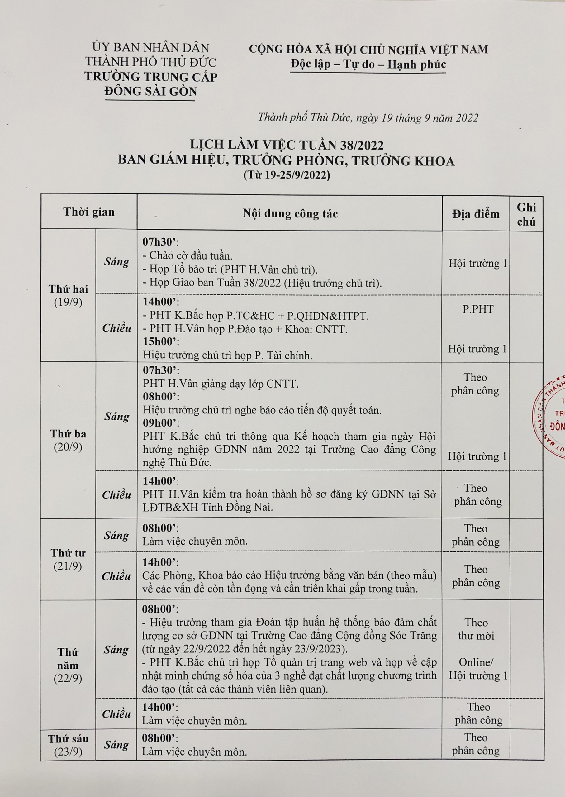 Lịch công tác Tuần 38/2022 của Trường Trung cấp Đông Sài Gòn.