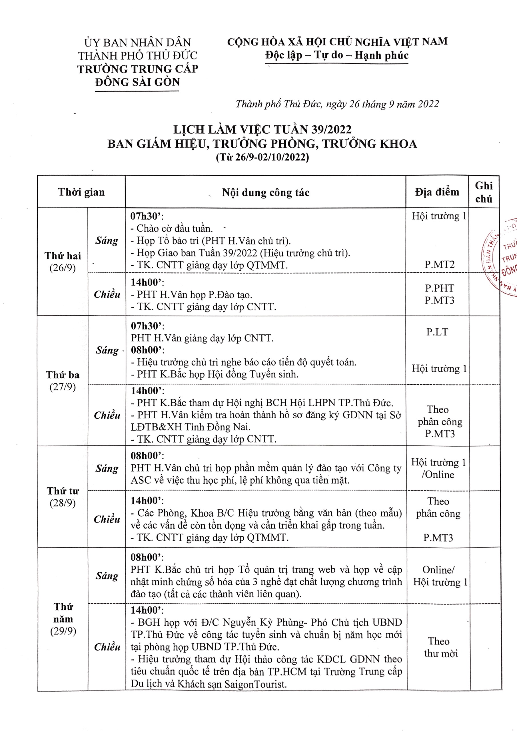 Lịch công tác Tuần 39/2022 của Trường Trung cấp Đông Sài Gòn.