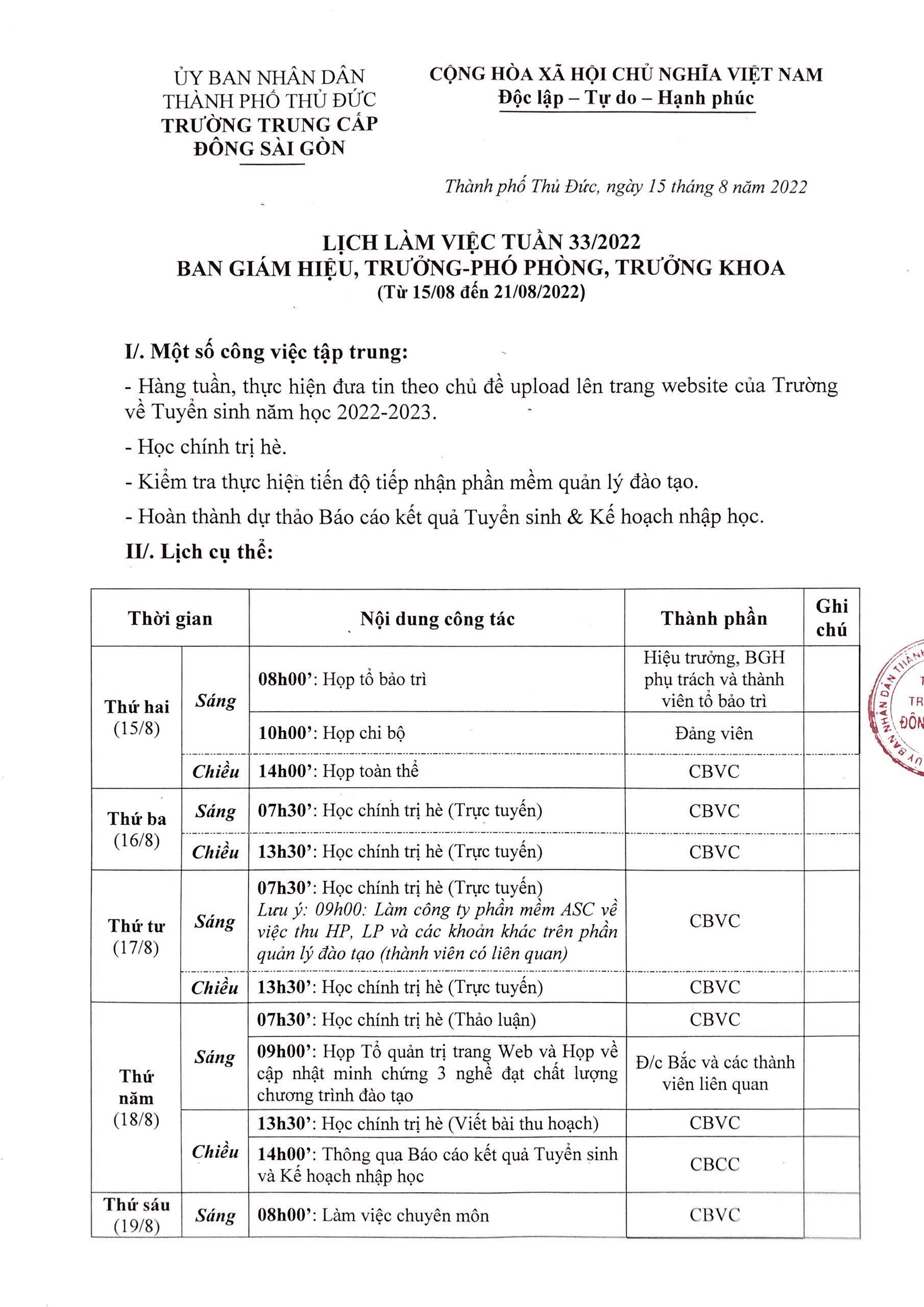 Lịch Công Tác Tuần 33/2022 Của Trường Trung Cấp Đông Sài Gòn
