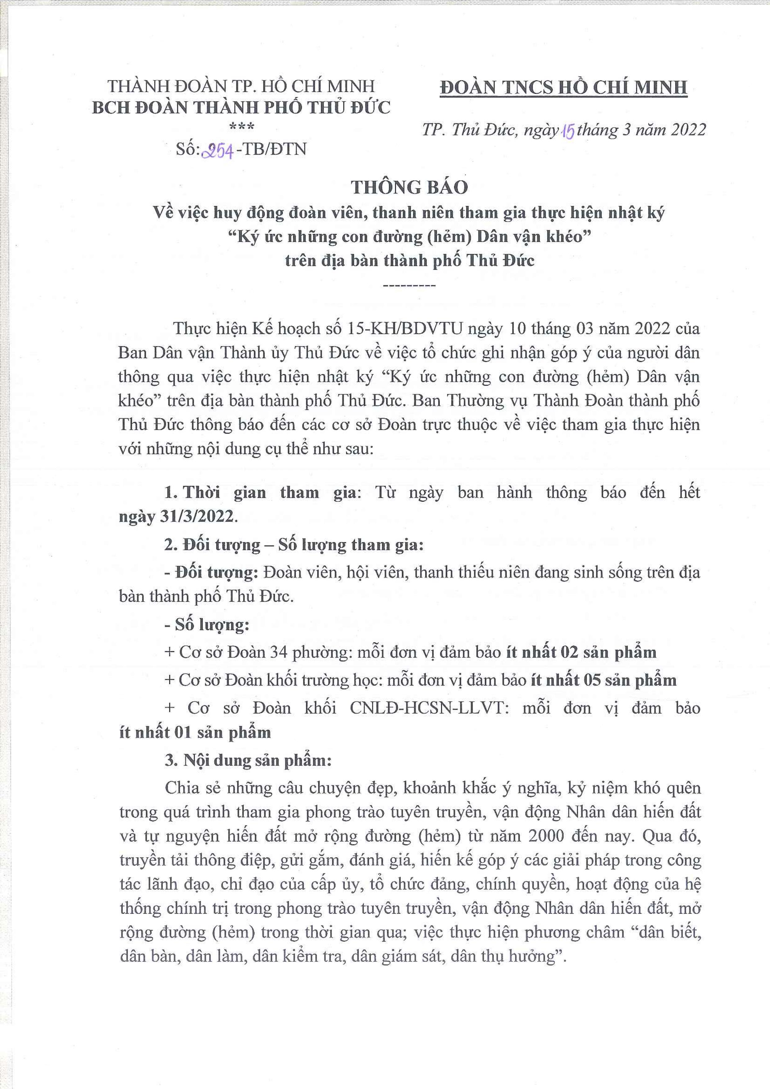 THÔNG BÁO: Về việc huy động đoàn viên, thanh niên tham gia thực hiện nhật ký ” Ký ức những con đường (hẻm) Dân vận khéo ” trên địa bàn thành phố Thủ Đức