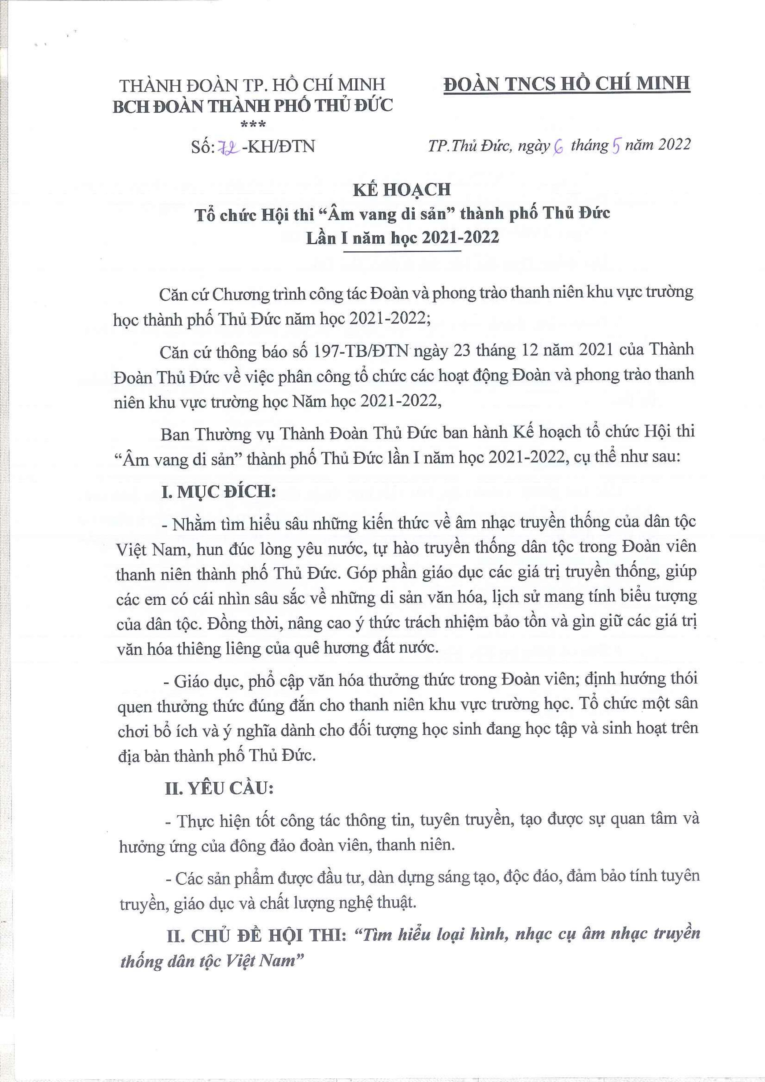 KẾ HOẠCH: Tổ chức hội thi ” Âm vang di sản ” Thành Phố Thủ Đức lần thứ I năm học 2021 – 2022