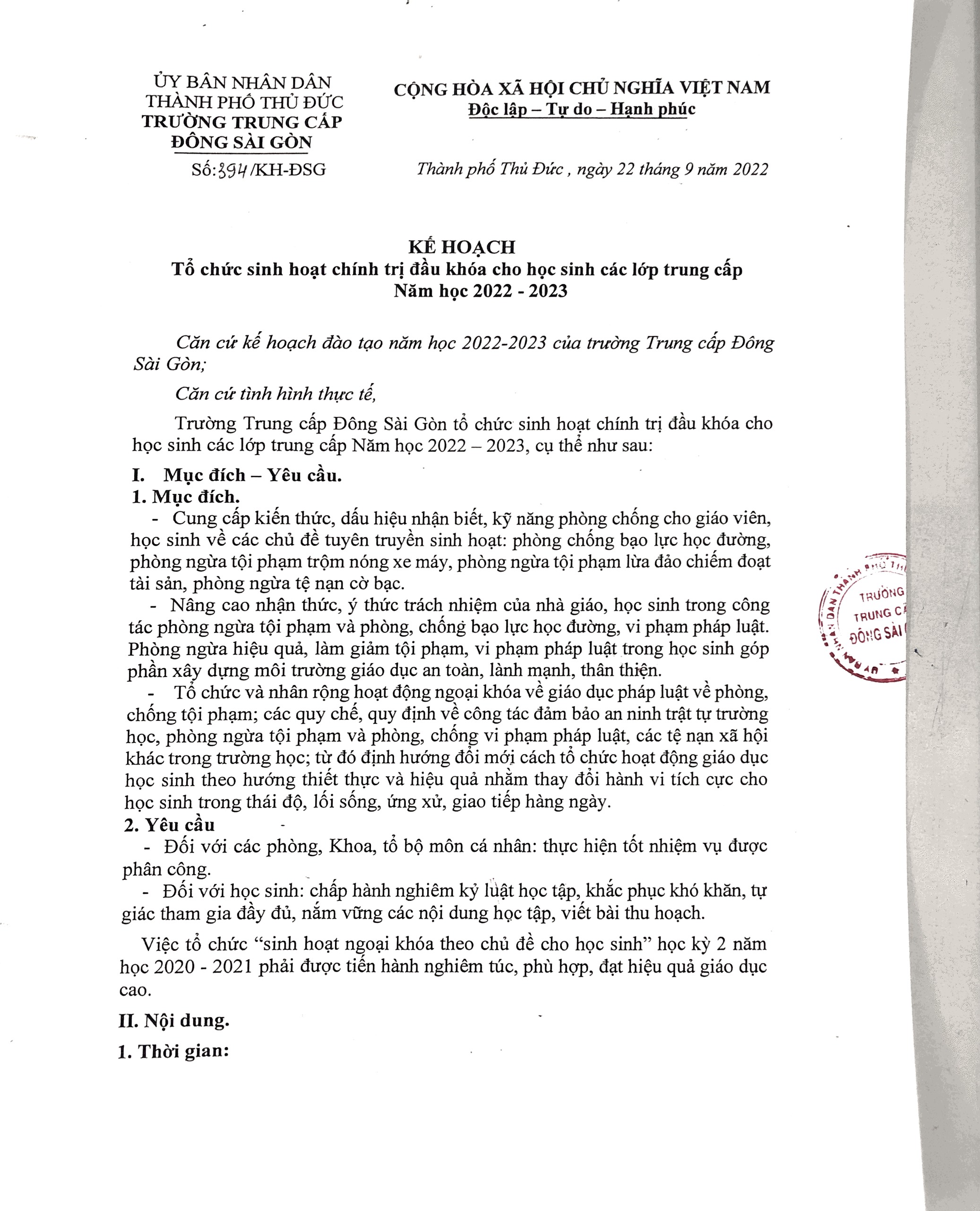 Kế hoạch sinh hoạt chính trị đầu khóa cho học sinh các lớp trung cấp năm học 2022-2023