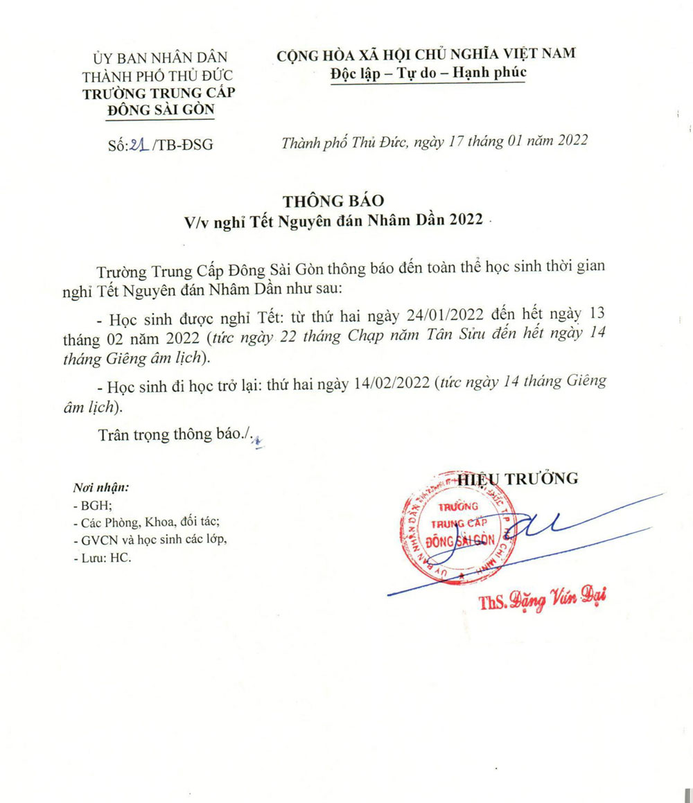 Trường trung cấp Đông Sài Gòn thông báo đến toàn thể Học Sinh, Sinh Viên về việc nghỉ Tết nguyên đán Nhâm Dần 2022