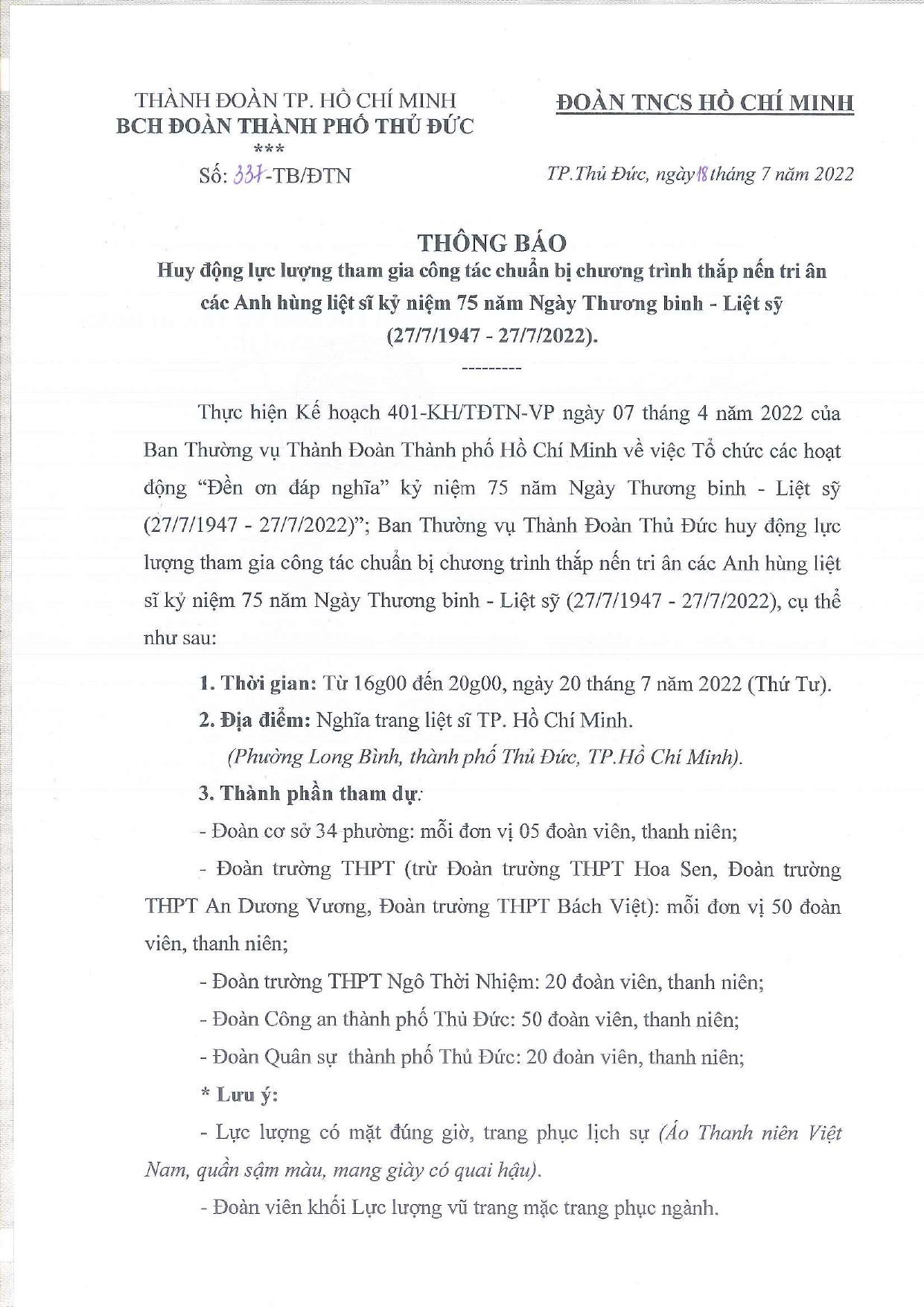 THÔNG BÁO: HUY ĐỘNG LỰC LƯỢNG THAM GIA CÔNG TÁC CHUẨN BỊ CHƯƠNG TRÌNH LỄ THẮP...