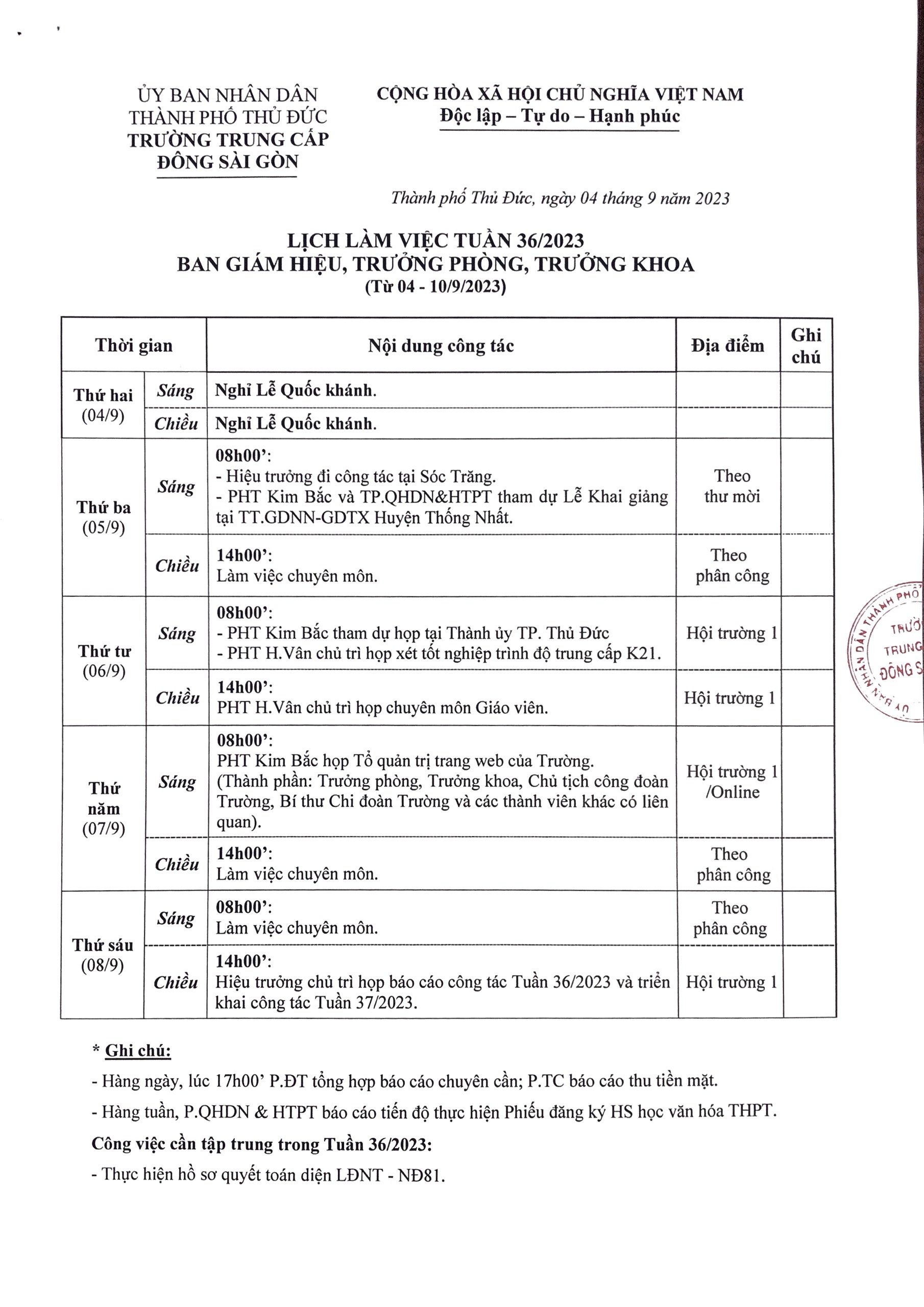 Lịch Công Tác Tuần 36/2023 Của Trường Trung Cấp Đông Sài Gòn