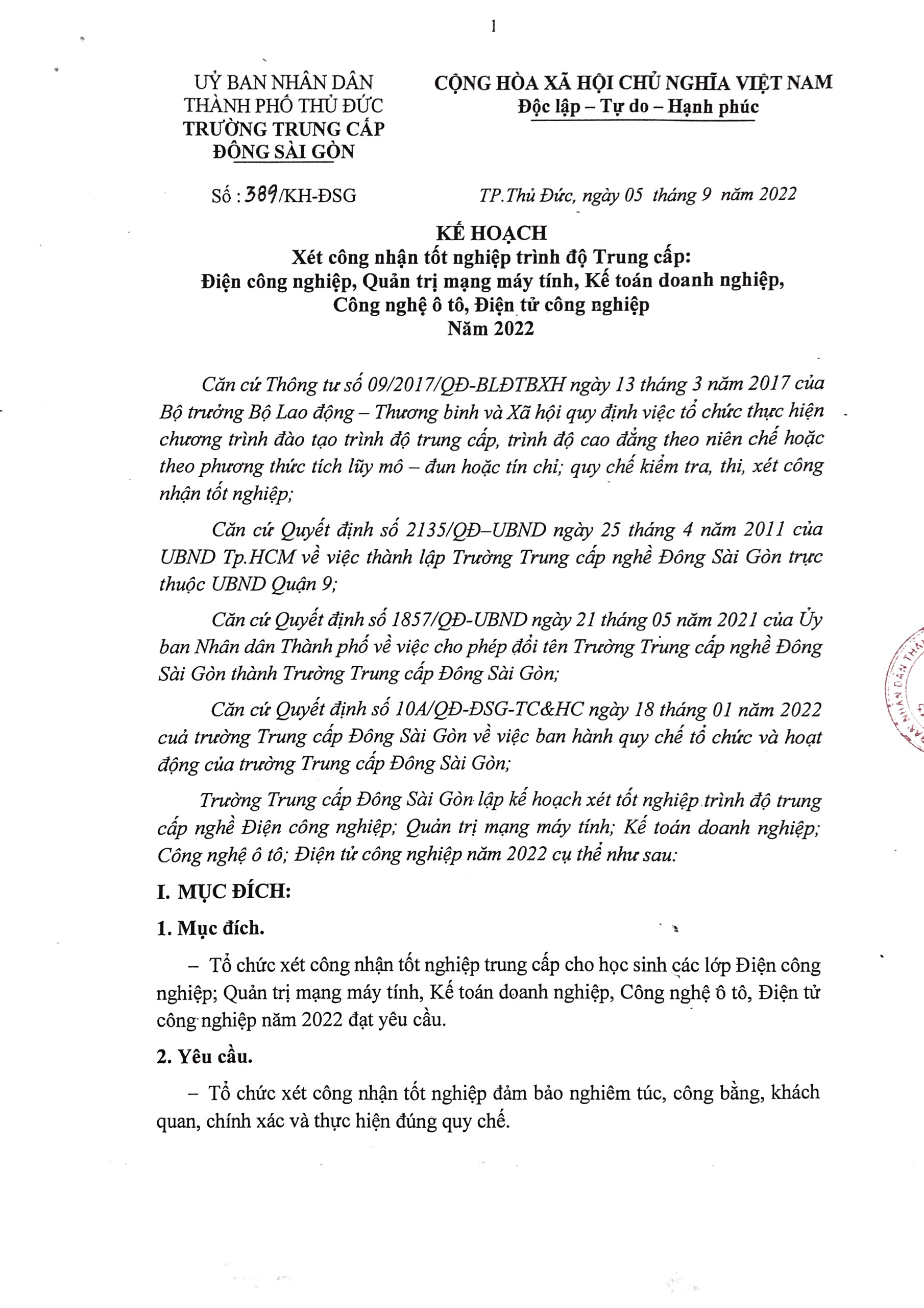 KẾ HOẠCH: Xét công nhận tốt nghiệp trình độ trung cấp: Điện Công Nghiệp, Quản Trị Mạng Máy Tính, Kế Toán Doanh Nghiệp, Công Nghệ Ô Tô, Điện Tử Công Nghiệp năm 2022