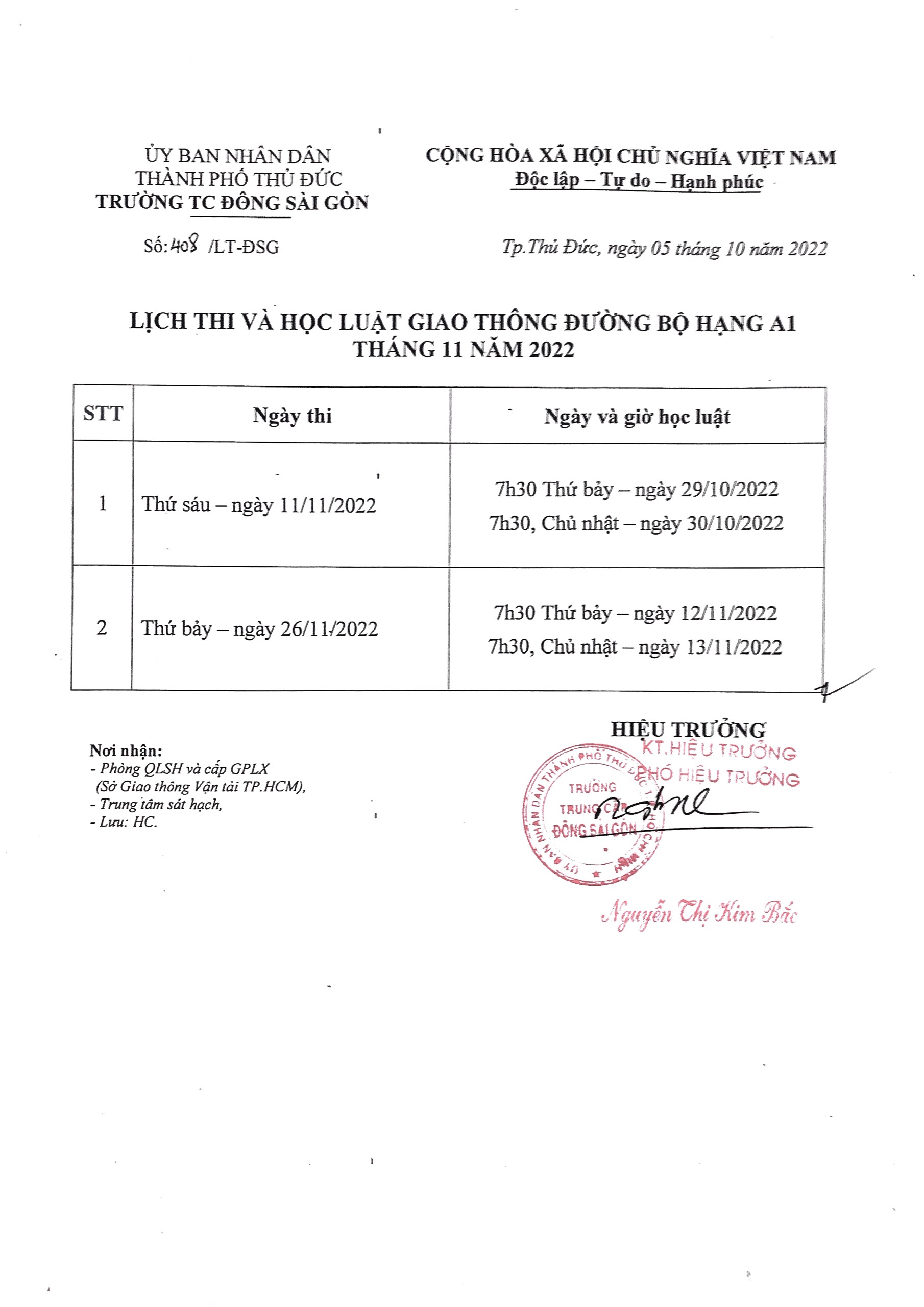 Thông báo lịch thi và học luật GT đường bộ hạng A1 tháng 11