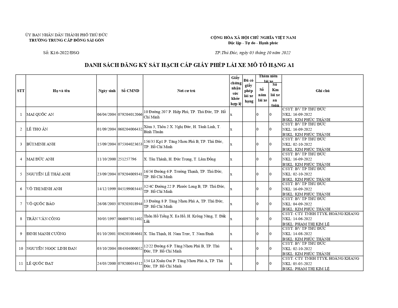 Danh sách thi sinh tham dự cấp GPLX A1 ngày 16/10 Bấm tải tài liệu: K16...