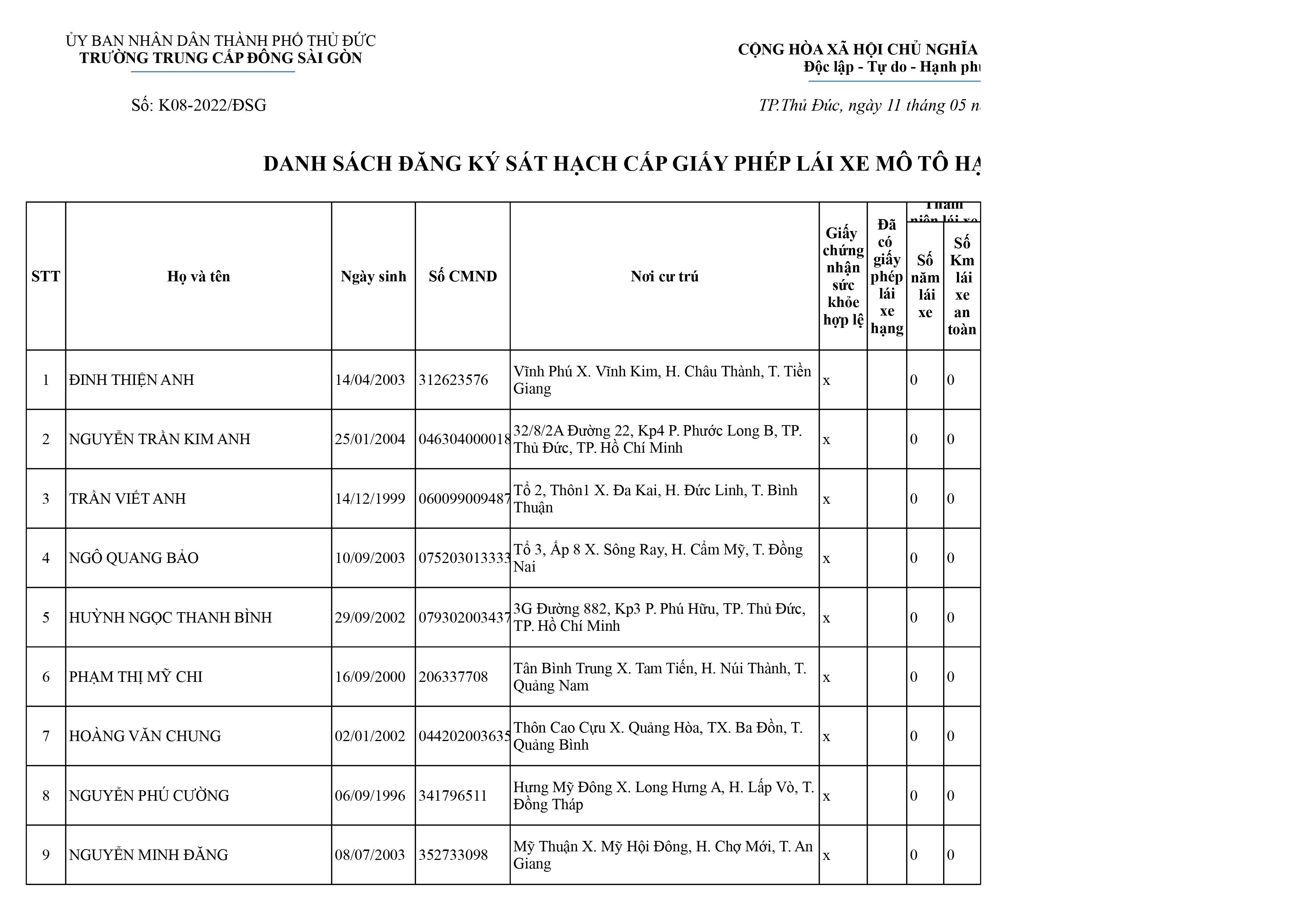 Danh Sách Thi Lái Xe Môtô Hạng A1 Của Trường TC Đông Sài Gòn Ngày...