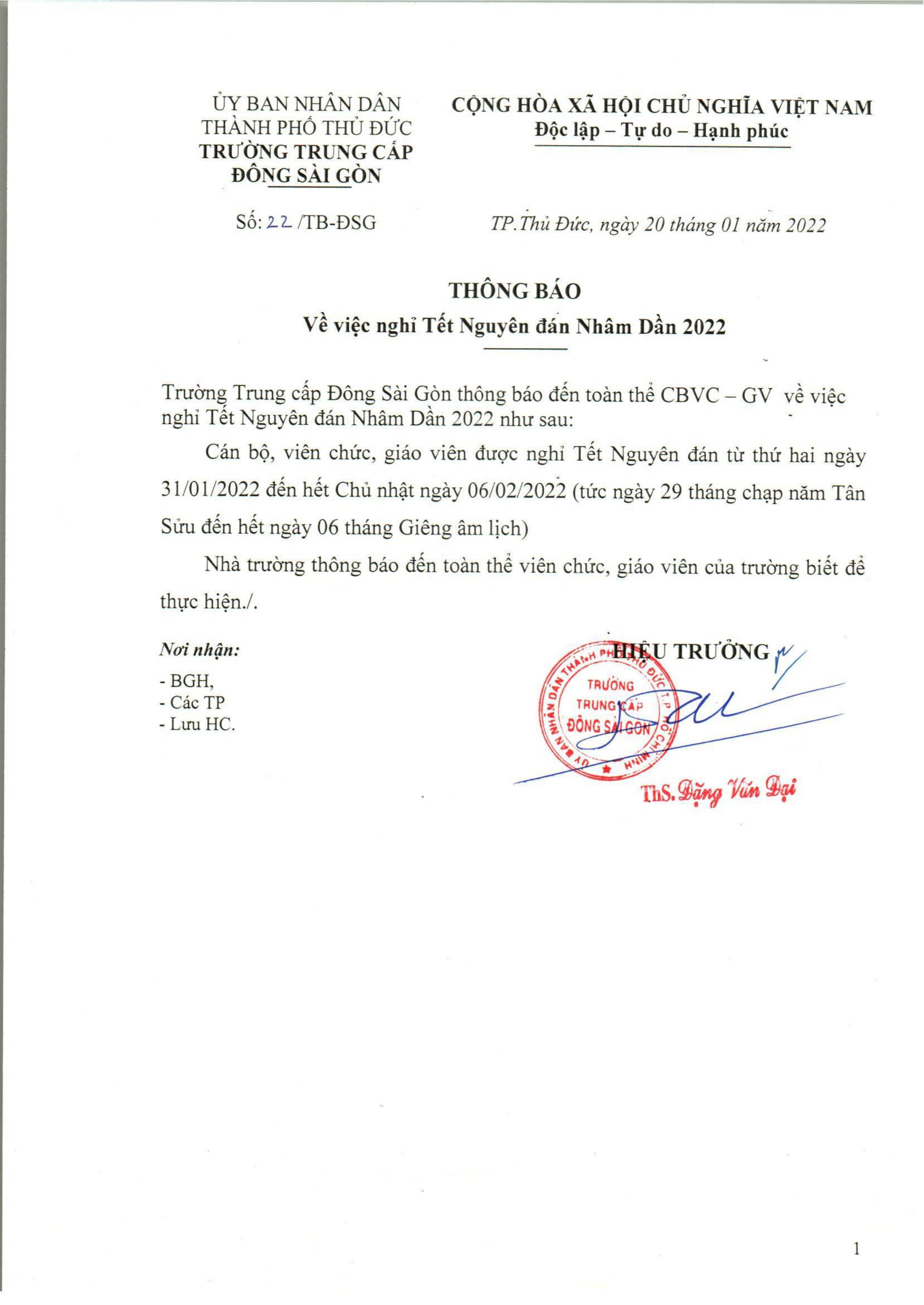 Trường trung cấp Đông Sài Gòn thông báo đến toàn thể CBVC – GV về việc nghỉ Tết nguyên đán Nhâm Dần 2022