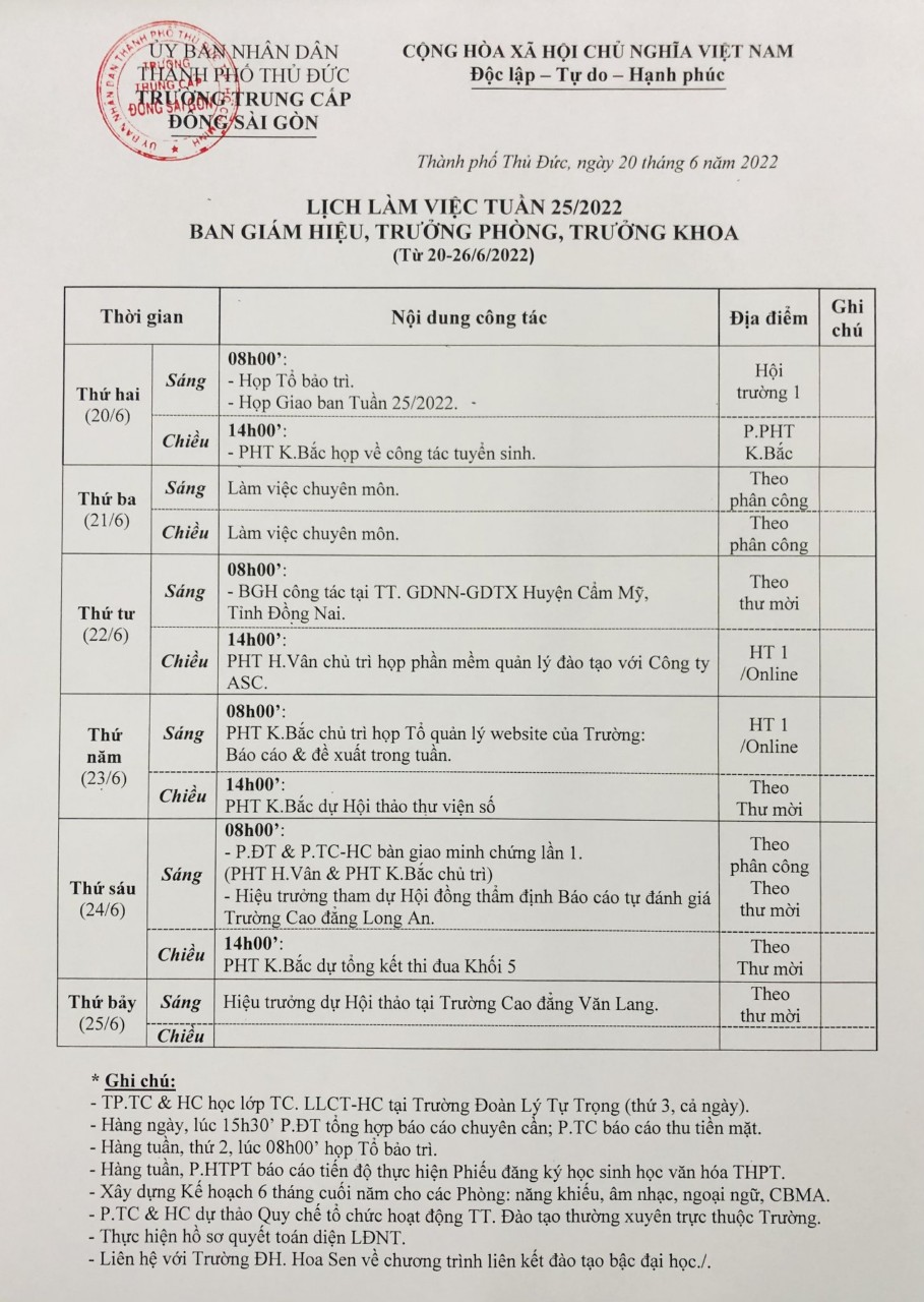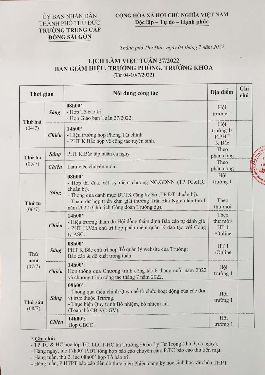 Lịch công tác Tuần 27/2022 của Trường Trung cấp Đông Sài Gòn.