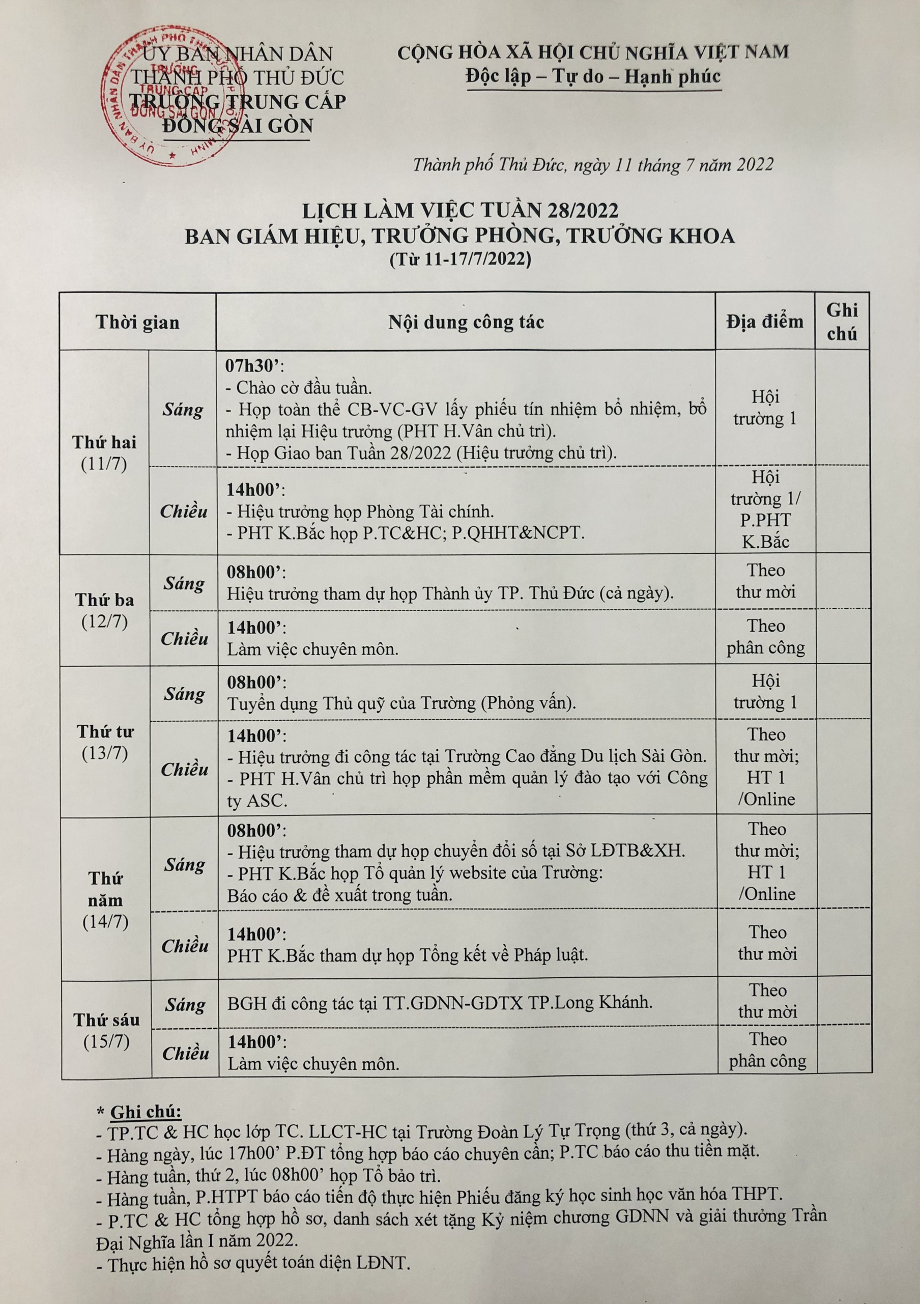 Lịch Công Tác Tuần 28/2022 Của Trường Trung Cấp Đông Sài Gòn.