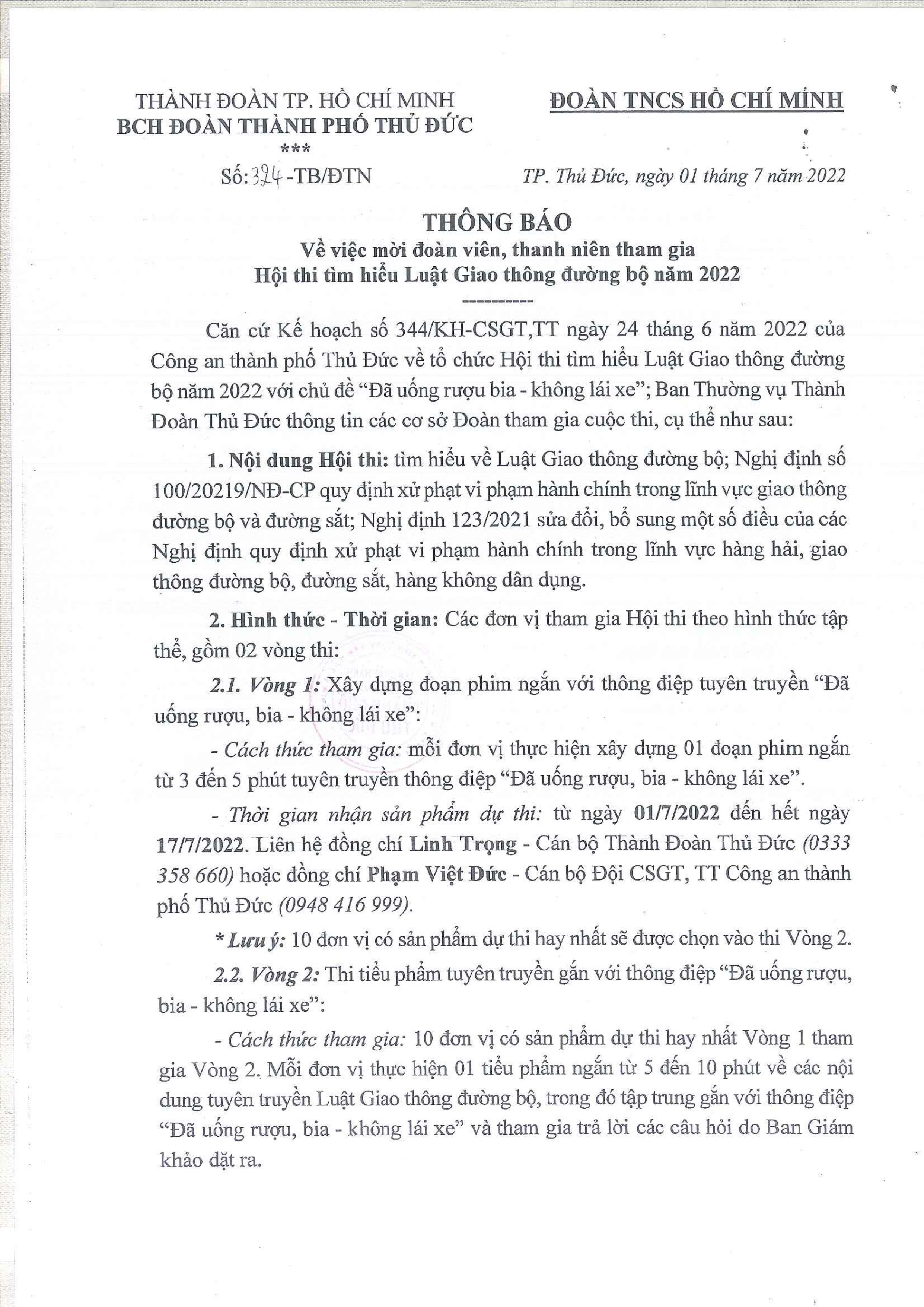 THÔNG BÁO: Mời đoàn thanh niên tham gia Hội thi tim hiểu Luật giao thông đường bộ năm 2022