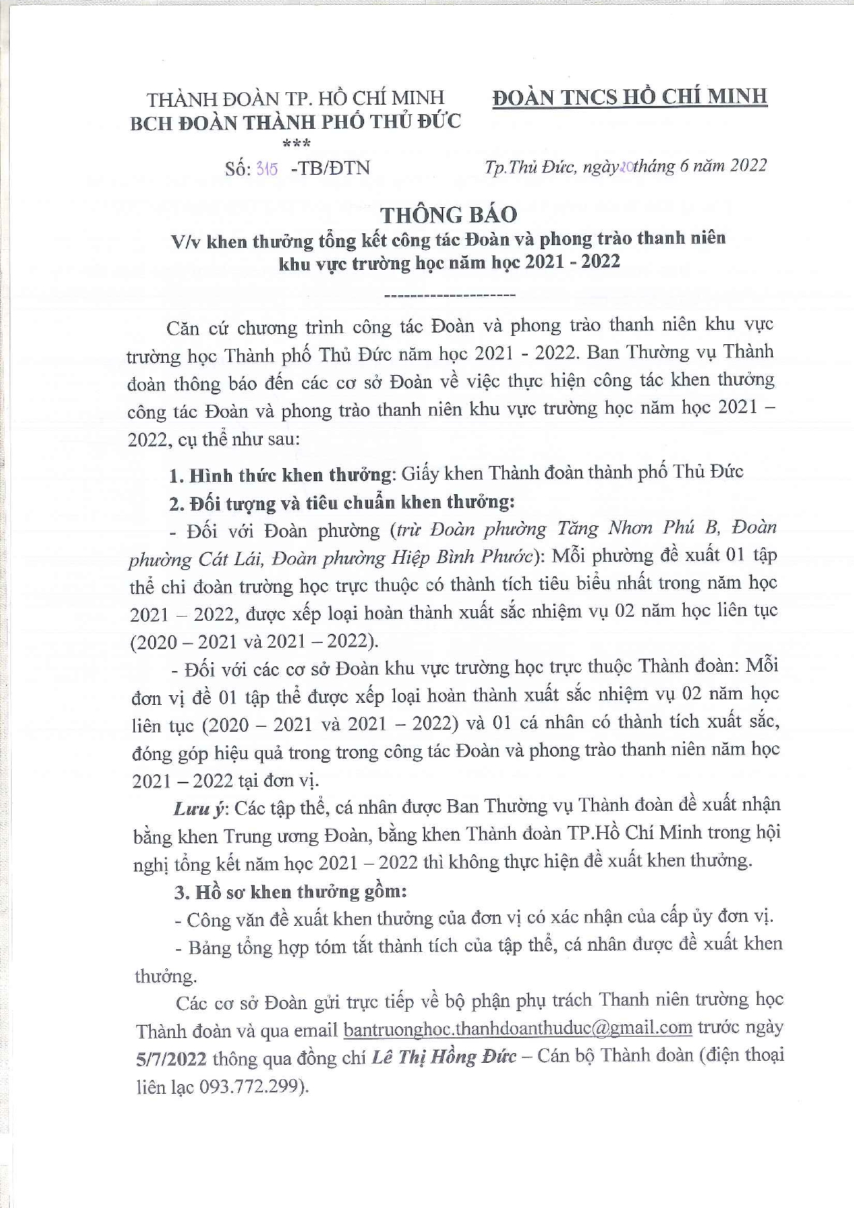 THÔNG BÁO: Khen thưởng tổng kết khu vực trường học năm học năm 2021- 2022