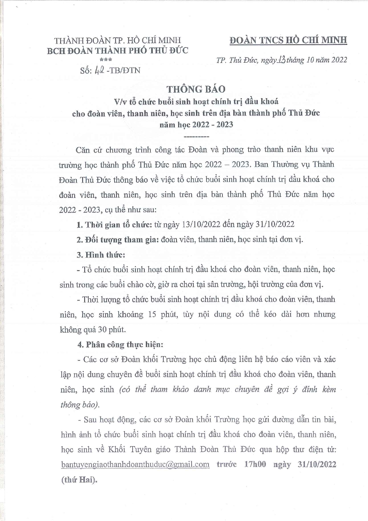 THÔNG BÁO: Tổ chức buổi sinh hoạt chính trị đầu khoá cho đoàn viên, thanh niên, học sinh trên địa bàn toàn thành phố Thủ Đức năm học 2022 – 2023