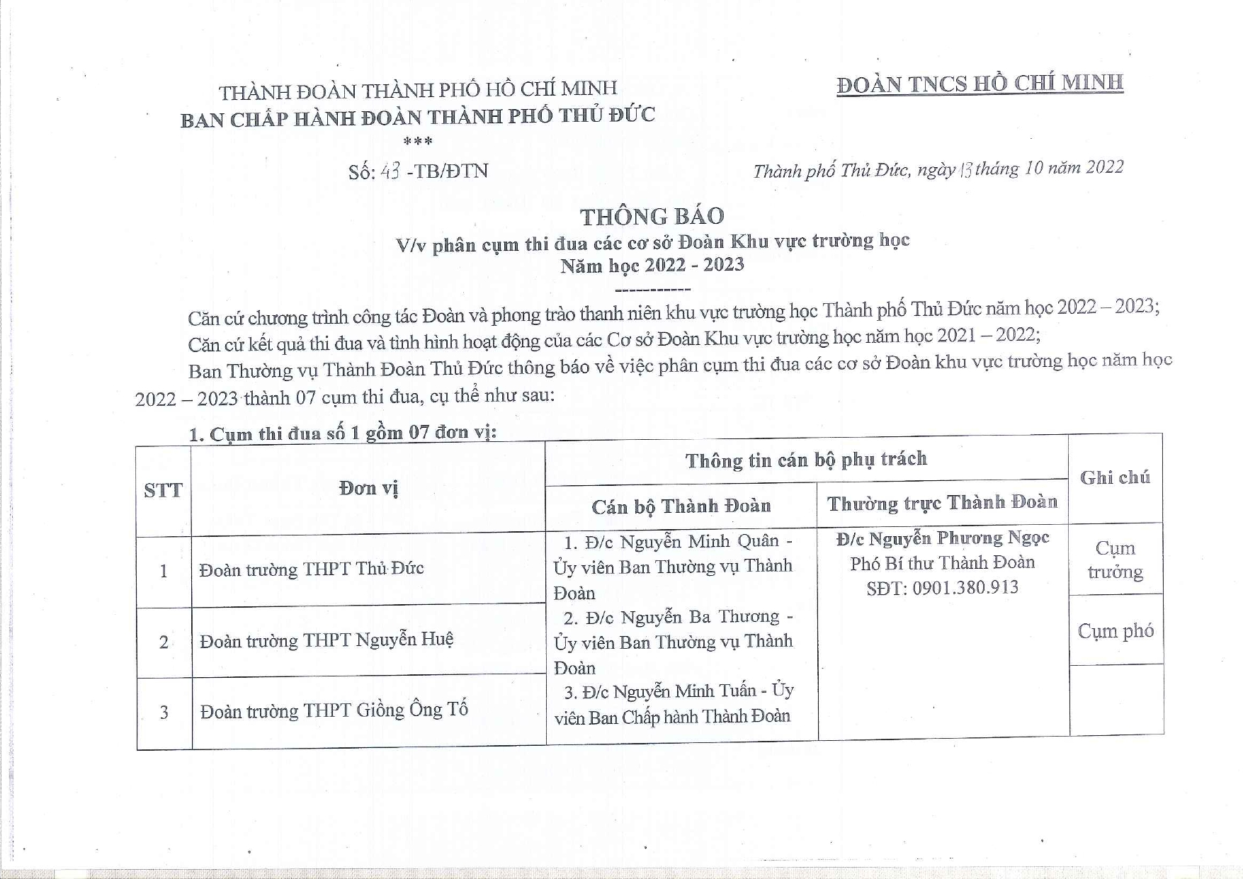 THÔNG BÁO: Phân cụm thi đua cơ sở Đoàn Khu vực trường học năm học 2022 – 2023