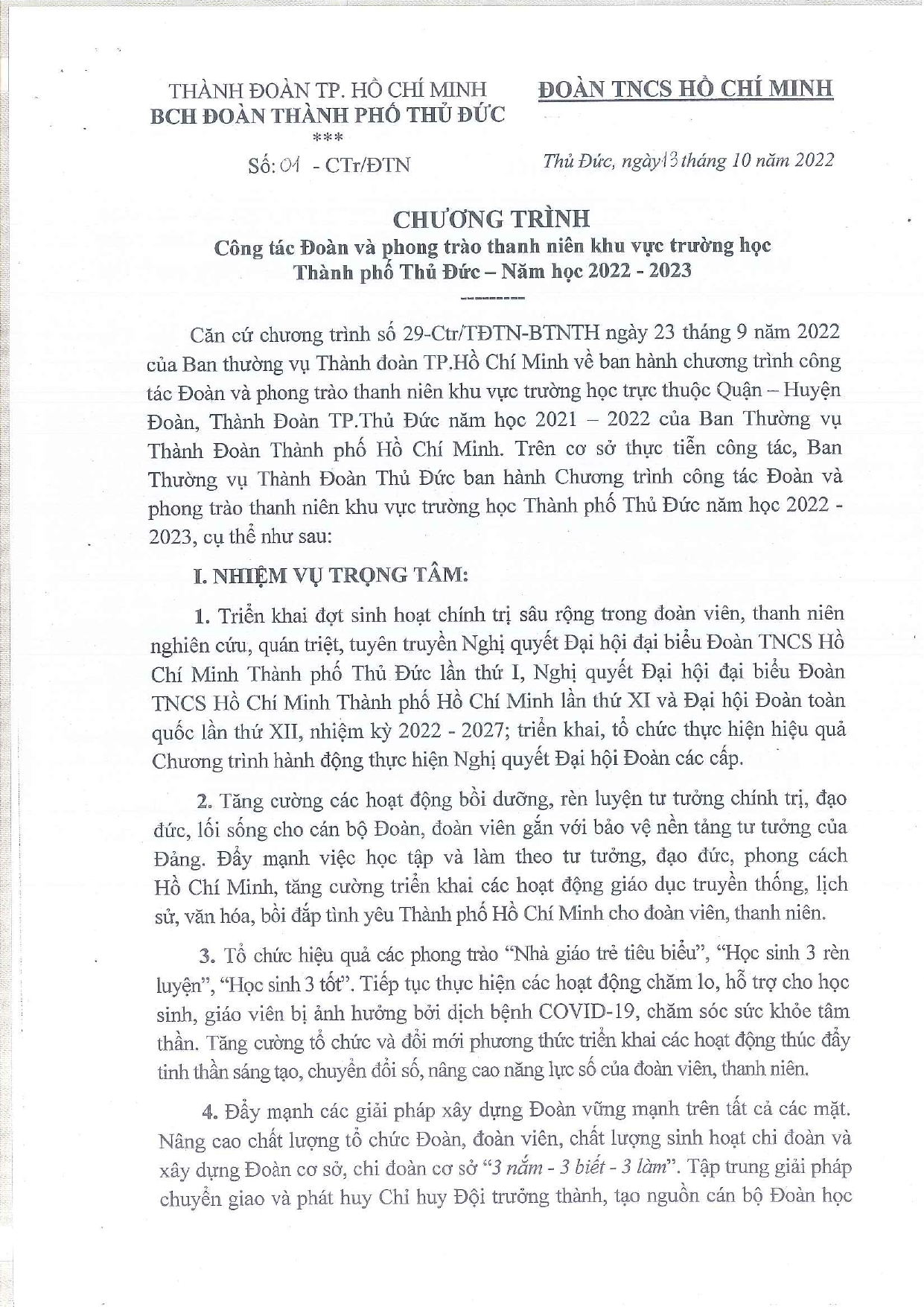 CHƯƠNG TRÌNH: Công tác Đoàn và phong trào thanh niên khu vực trường học Thành phố Thủ Đức – Năm học 2022 – 2023