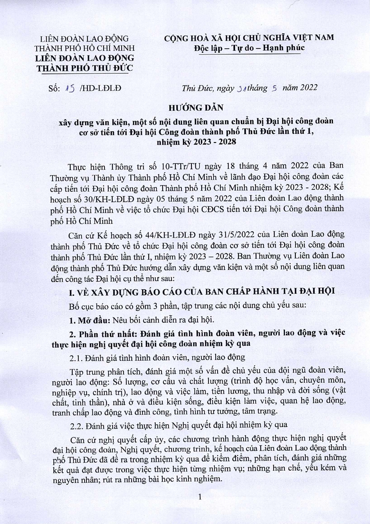HƯỚNG DẪN: Xây dựng văn kiện Đại hội Công Đoàn Thành Phố Thủ Đức lần thứ 1, nhiệm kỳ...