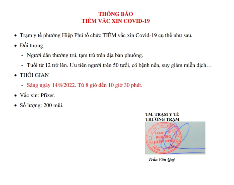 THÔNG BÁO: TIÊM VACIN COVID -19 TẠI PHƯỜNG HIỆP PHÚ