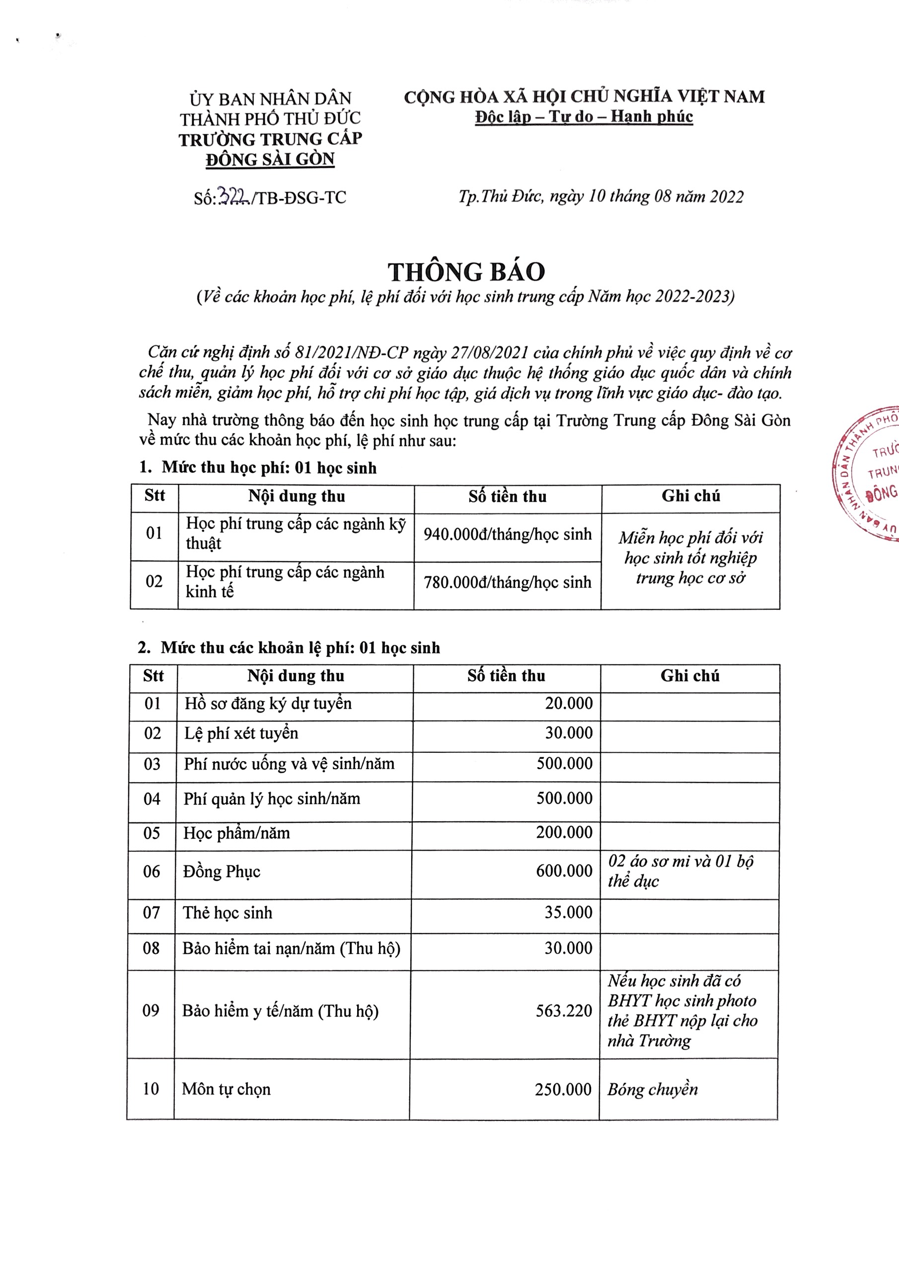 Trường Trung cấp Đông Sài Gòn thông báo về các khoản học phí, lệ phí...