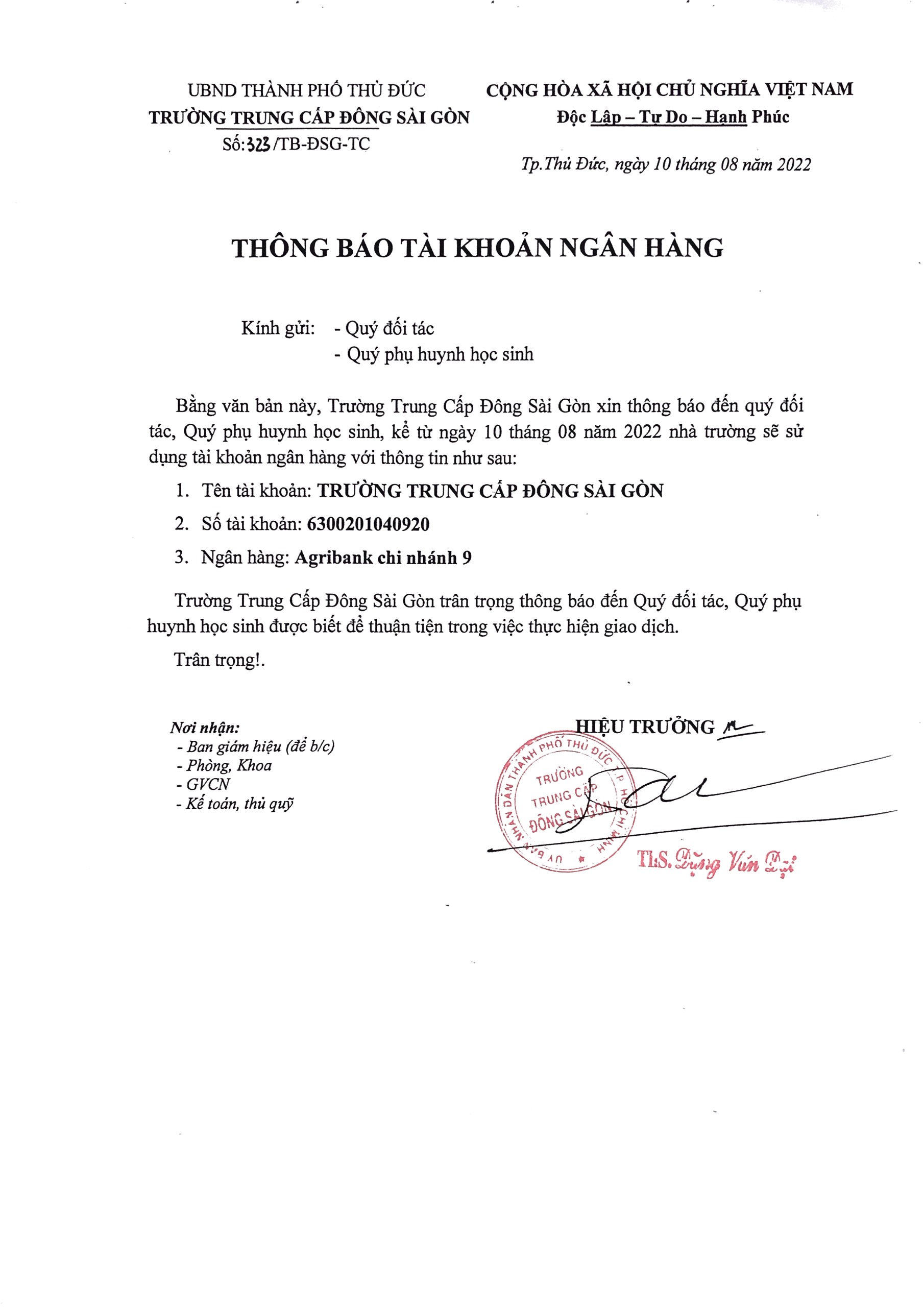 Thông báo tài khoản ngân hàng Trường trung cấp Đông Sài Gòn