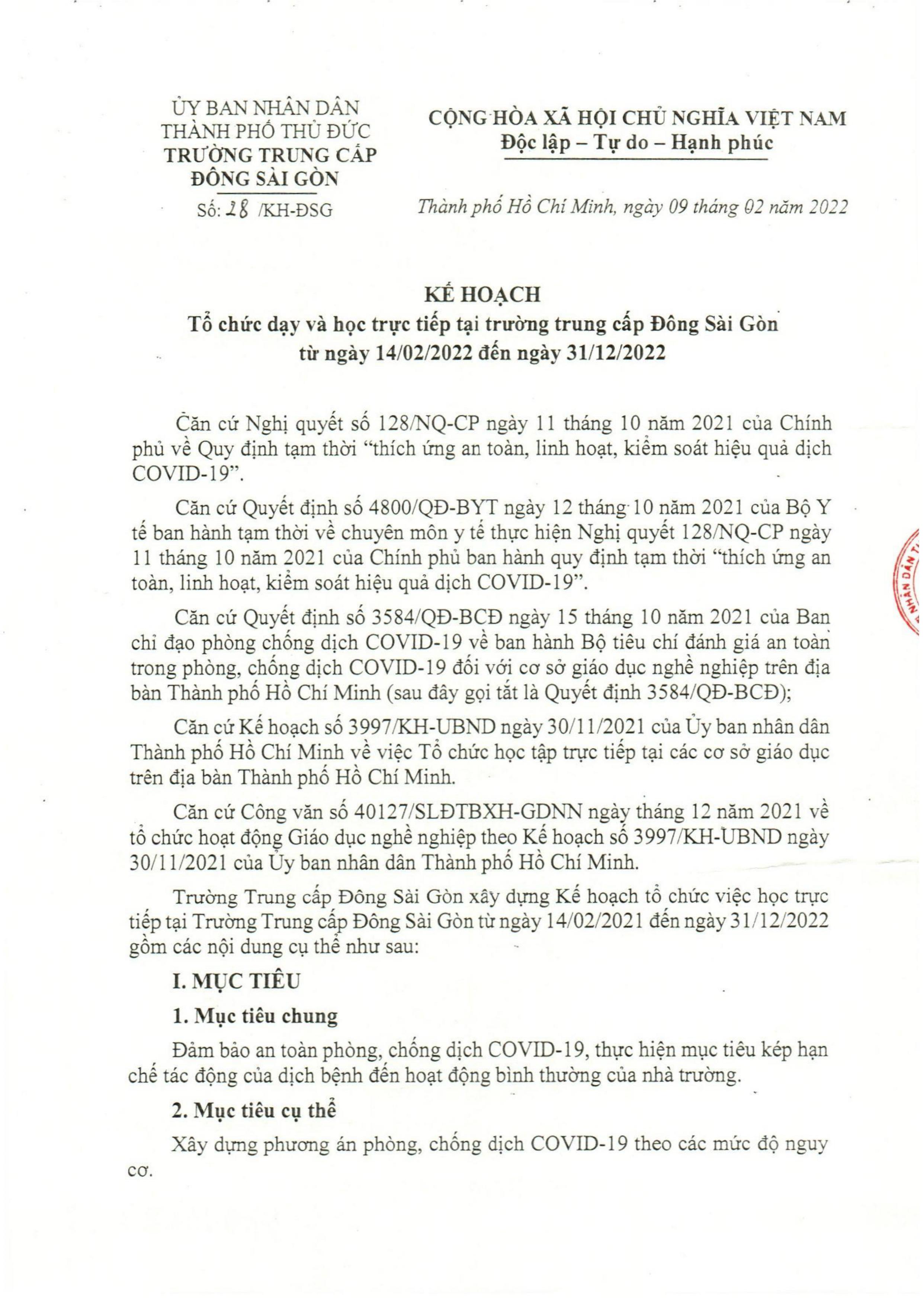 Kế Hoạch: Tổ chức dạy và học trực tuyến tại trường TC Đông Sài Gòn từ ngày 14/02/2022 đến ngày 31/12/2022