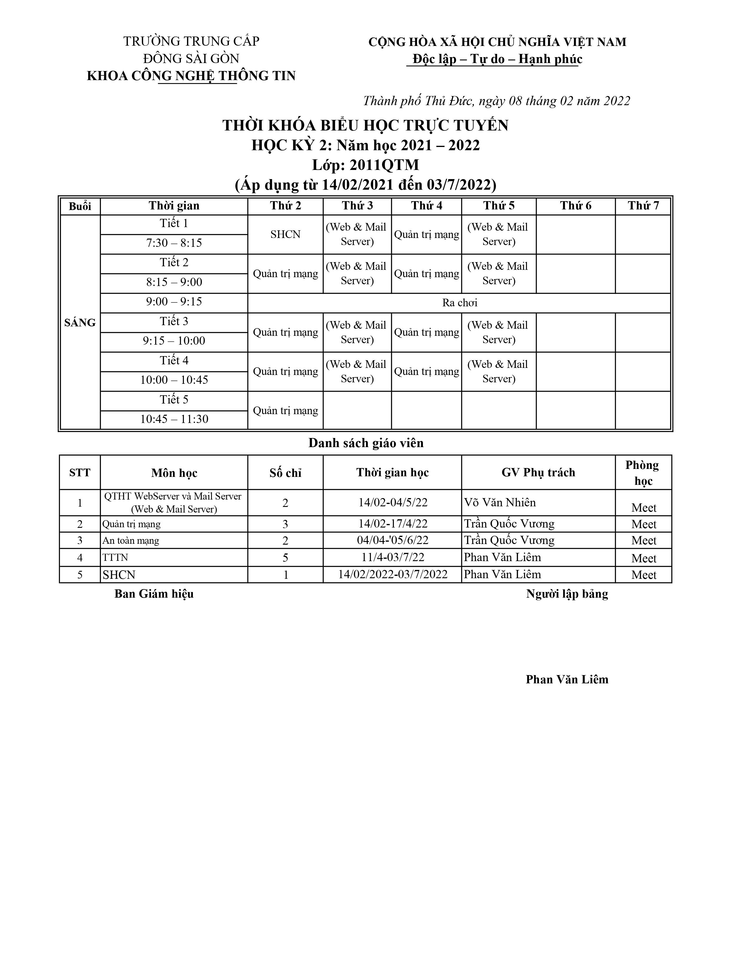 Thời Khoá Biểu Học Trực Tuyến Các Lớp Trung Cấp – Học Kỳ 2 – Năm Học 2021 – 2022 – Lớp: 2101QTM (Áp dụng từ 14/02/2021 đến 03/7/2022)
