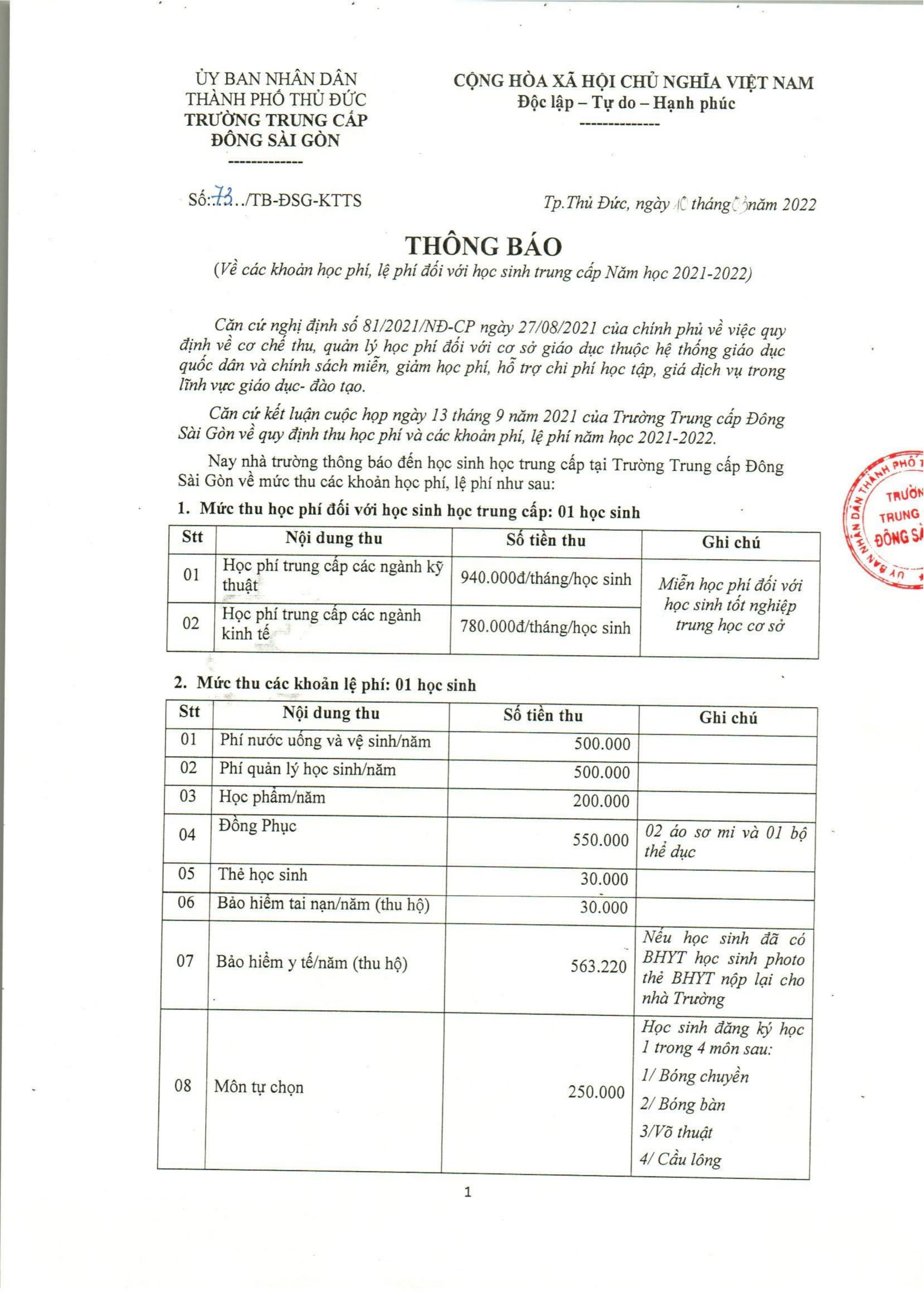 Thông báo về các khoản học phí, lệ phí năm học 2021-2022