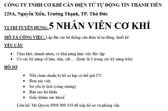 THÁNG 4 – TUYỂN DỤNG NHÂN VIÊN CƠ KHÍ