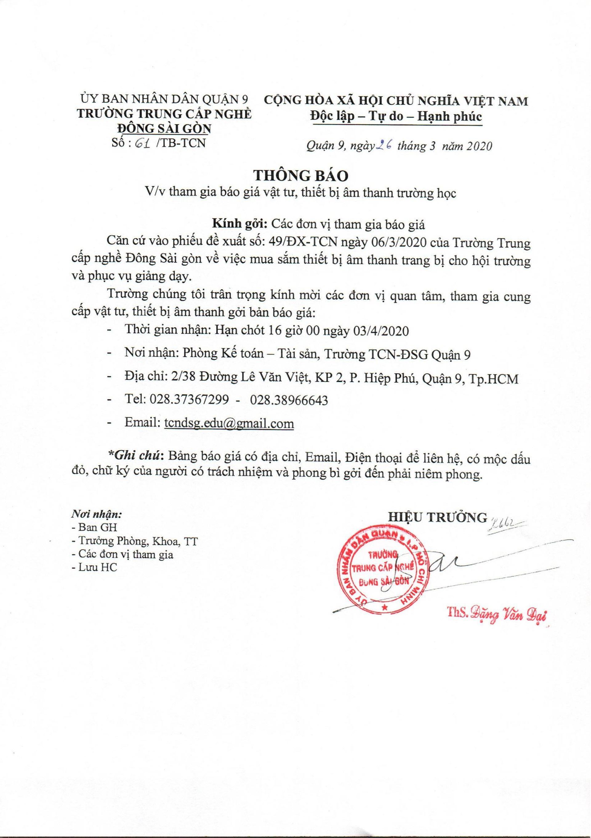 Trường trung cấp nghề ĐSG thông báo tham gia báo giá vật tư, thiết bị âm thanh cho trường học.