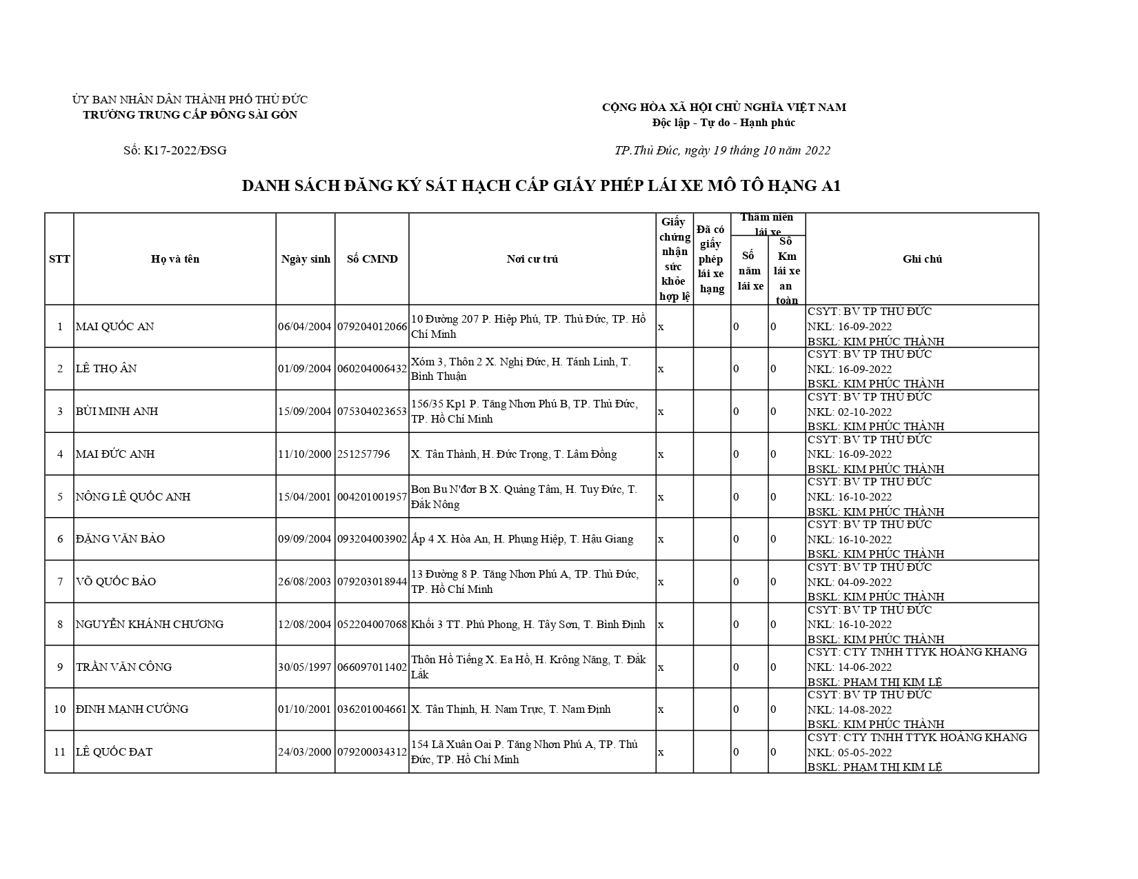 Danh Sách Thi Sinh Tham Dự Cấp GPLX A1 Ngày 19/10