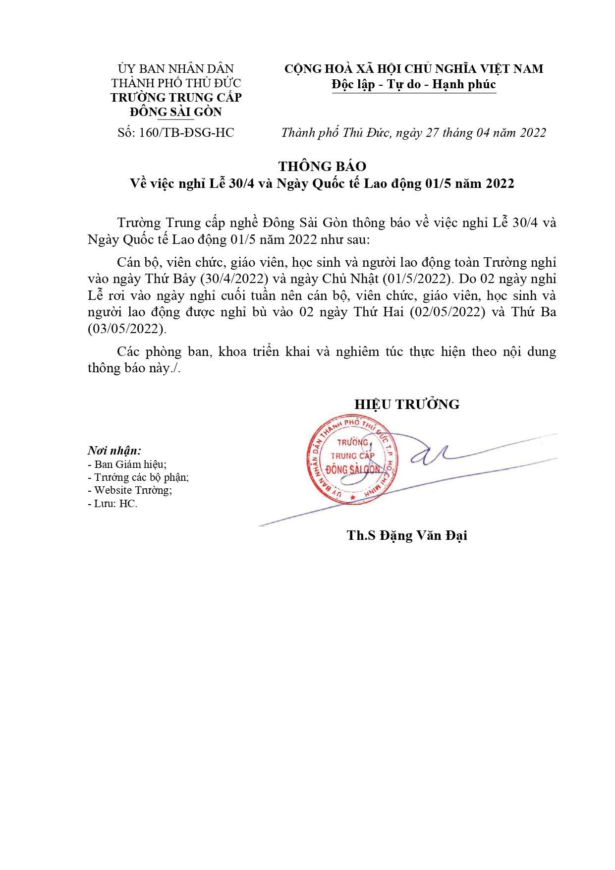 Trường Trung cấp nghề Đông Sài Gòn thông báo về việc nghỉ Lễ 30/4 và...