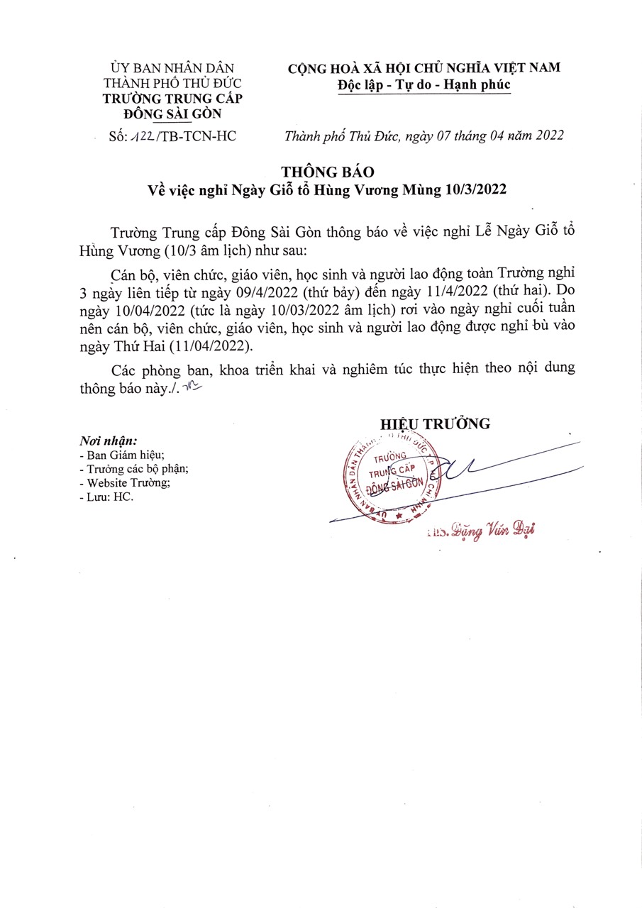 Lịch nghỉ Lễ Giỗ tổ Hùng Vương của trường TC ĐSG được nghỉ 2 ngày (10, 11/4/2022)
